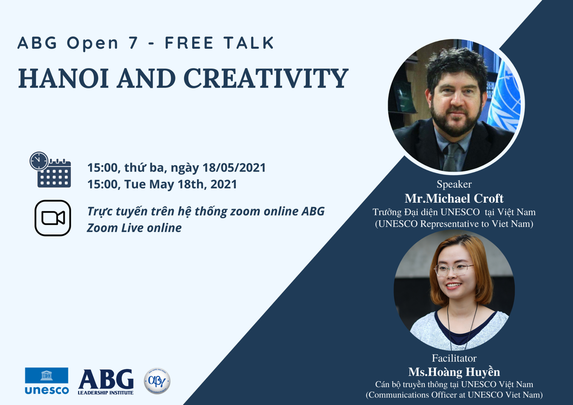 Chương trình “ĐỐI THOẠI CÙNG TRƯỞNG ĐẠI DIỆN UNESCO TẠI VIỆT NAM” chủ đề Hà Nội và sáng tạo do UNESCO tại Việt Nam và Viện lãnh đạo ABG tổ chức. Thân mời các bạn trẻ tham dự đối thoại trực tuyến cùng ông Michael Croft – Trưởng Đại diện UNESCO tại Việt Nam. Chúng tôi mong chờ sự tham gia nhiệt tình và những câu hỏi đầy tư duy phản biện của bạn!