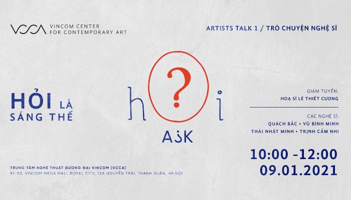 VCCA hân hạnh giới thiệu Artist talk đầu tiên trong triển lãm HỎI với sự tham gia của các nghệ sĩ Thái Nhật Minh, Vũ Bình Minh, Quách Bắc và Trịnh Cẩm Nhi cùng giám tuyển của triển lãm: Hoạ sĩ Lê Thiết Cương.