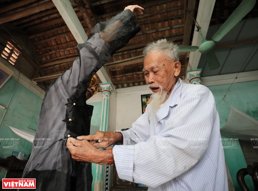 Trong ngôi nhà cấp bốn theo lối kiến trúc cổ bắc bộ xưa, cụ Nguyễn Văn Nhiên (86 tuổi), người đã có gần 70 năm làm nghề may áo dài chậm rãi chia sẻ về nghề của làng.Theo cụ, người dân trong làng luôn lưu truyền câu chuyện truyền thuyết về nghề may áo dài của làng cho con cháu từ đời này qua đời khác như một cách tri ân tổ nghề.