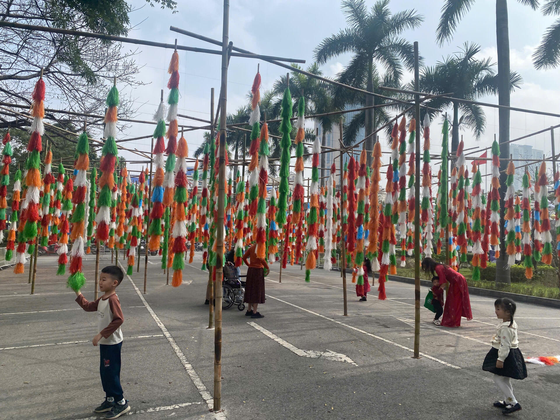 Trên giàn tre mộc mạc, những chiếc roi tuồng được làm từ vật liệu tái chế khẽ đung đưa theo gió, tạo nên nhịp điệu thị giác sinh động. Tre chất liệu quen thuộc của làng quê Việt, khi kết hợp cùng gam màu tươi vui đã tạo nên cảm giác vừa thân thuộc vừa mới mẻ, như sự gặp gỡ giữa truyền thống và sáng tạo đương đại.