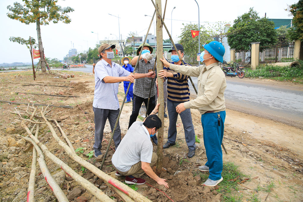 Người dân xã Liên Hà (huyện Đông Anh) chuyển cây xanh vào hố trồng tại một tuyến đường thuộc thôn Giao Tác.