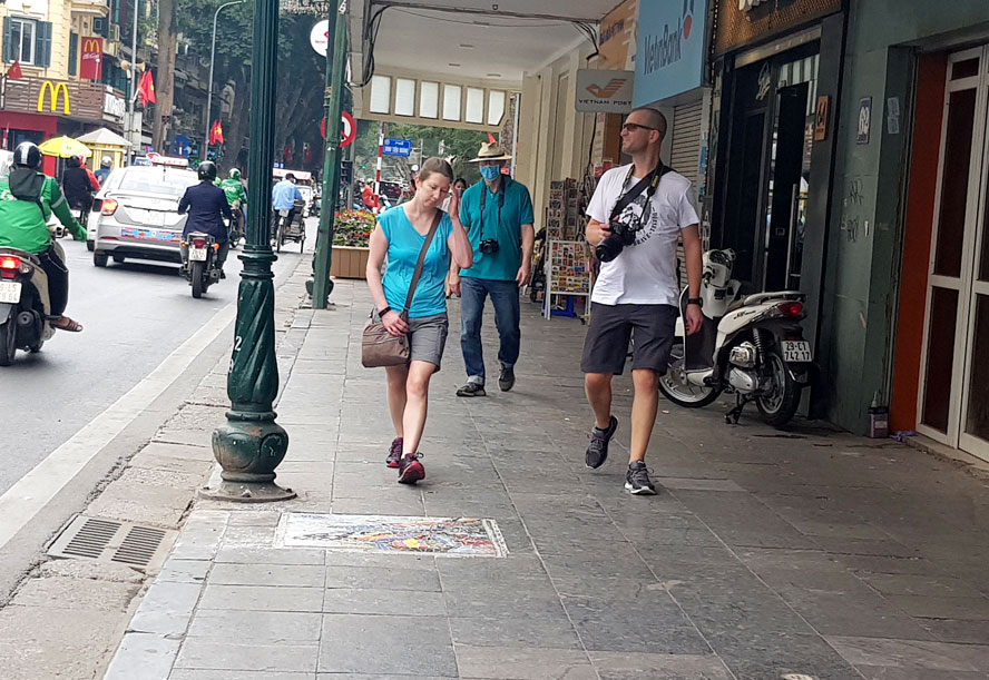 Du khách nước ngoài thích thú khi ngắm các tác phẩm nghệ thuật Mosaic gốm tại phố Tràng Tiền và Đinh Tiên Hoàng, quận Hoàn Kiếm