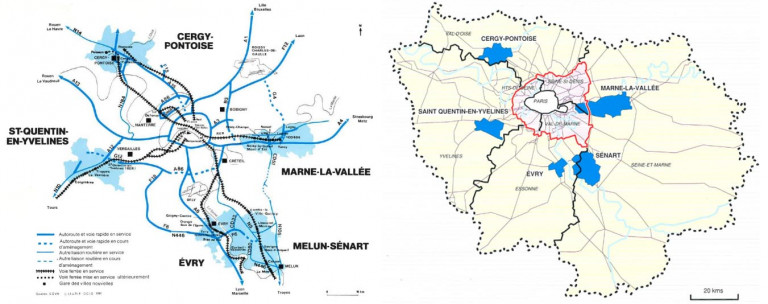 Trước khi xây dựng đô thị mới, nhiều khu dân cư lớn với hơn 8.000 người đã được xây dựng ở ngoại ô Paris ngay sau Thế chiến thứ hai, nhưng tất cả không có gì khác hơn là thúc đẩy sự hỗn độn. Rút kinh nghiệm từ thực tế là các khu dân cư lớn đơn chức năng chỉ càng ngày càng kéo theo nhiều vấn đề xã hội, người ta đã xây dựng các đô thị mới nhằm phân chia chức năng, đồng thời kết nối trực tiếp với trung tâm Paris thông qua mạng lưới giao thông. Ở đây, điều quan trọng nhất đó là, khác với việc xây dựng các đô thị mới trước đó ở Anh, Nhật Bản… chỉ là đô thị với nhà ở, các đô thị mới quanh Paris và ở Pháp là những TP mới thực sự, có tính tự lập, với nơi làm việc và cư trú gần nhau.