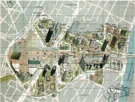 Đây là công trình xây dựng khu trung tâm đô thị mới đã trở thành hình mẫu của thế giới. Paris, nơi lưu giữ hầu như toàn bộ không gian đô thị lịch sử đã quyết định xây dựng La Défense – khu trung tâm mới với những tòa cao ốc ở ngoại ô Paris để thực hiện các hoạt động kinh tế – Hướng tới việc phân chia công năng riêng cho khu trung tâm cũ và mới, khu vực này kết nối trực tiếp với trung tâm cũ của Paris bằng 2 tuyến đường sắt là tàu điện ngầm và đường sắt ngoại ô. Cũng phải nói thêm rằng, một điểm được chú ý nữa chính là thiết kế đô thị của khu trung tâm mới này có sự kế thừa và nhất quán với khu trung tâm cũ về mặt không gian lịch sử.