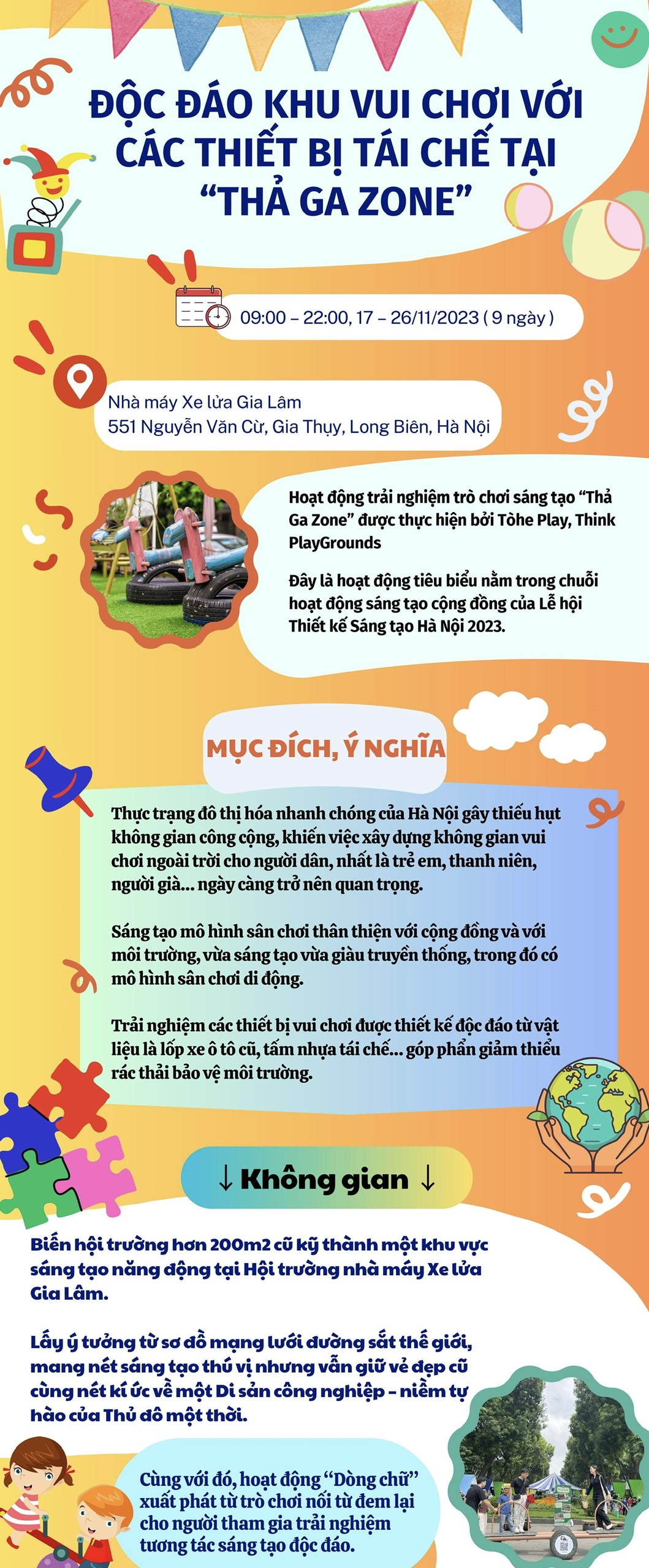 Hoạt động trải nghiệm trò chơi sáng tạo “Thả Ga Zone” được thực hiện bởi Tòhe Play, Think PlayGrounds là hoạt động tiêu biểu nằm trong chuỗi hoạt động sáng tạo cộng đồng của Lễ hội Thiết kế Sáng tạo Hà Nội 2023. Đây là dịp cho người tham gia được trải nghiệm những hoạt động đặc sắc và đầy ý nghĩa, mang đến môi trường phát triển tuyệt vời nhất cho trẻ em, truyền cảm hứng cho các sáng kiến cải tạo không gian công cộng tại các thành phố ở Việt Nam.