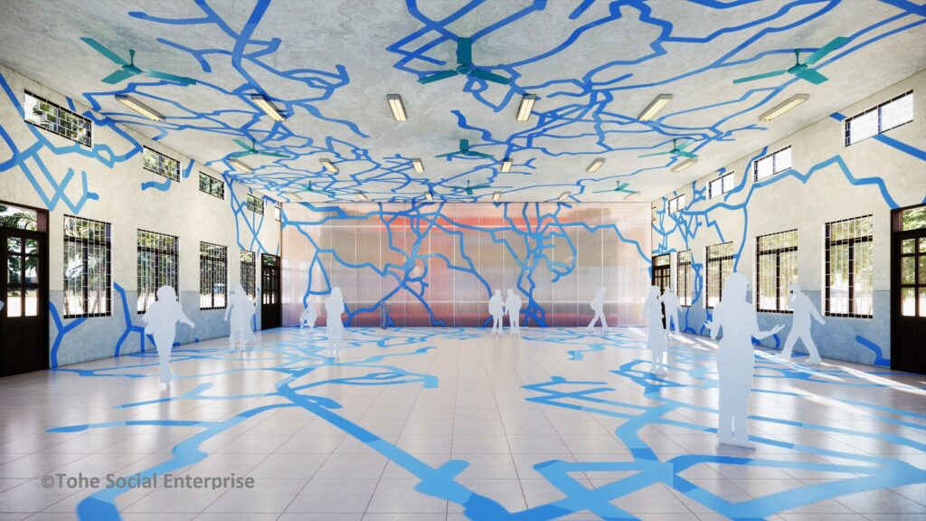 Bên cạnh đó, nhóm sáng tạo Tòhe Play biến hội trường hơn 200m2 cũ kỹ thành một khu vực sáng tạo năng động tại Hội trường nhà máy Xe lửa Gia Lâm. Không gian này lấy ý tưởng từ sơ đồ mạng lưới đường sắt thế giới, mang nét sáng tạo thú vị nhưng không làm mất đi vẻ đẹp cũ cùng nét kí ức về một Di sản công nghiệp – niềm tự hào của Thủ đô một thời. Cùng với đó, hoạt động “Dòng chữ” xuất phát từ trò chơi nối từ đem lại cho người tham gia trải nghiệm tương tác sáng tạo độc đáo.