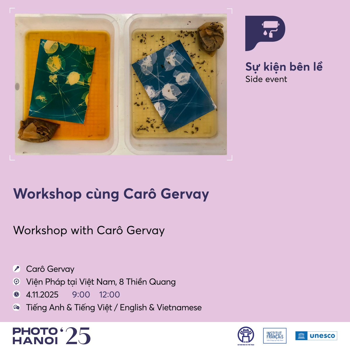 Trong workshop với Carô Gervay, người tham dự cùng đọc các đoạn trích “Cô gái lai da trắng” của Kim Lefèvre bằng tiếng Pháp, Việt và Anh để nhận diện các lớp nghĩa khi dịch thuật. Từ đó, họ tạo ra những bản in nhiếp ảnh thử nghiệm như một không gian diễn giải – Nơi chữ, hình và cảm thức cá nhân giao thoa.