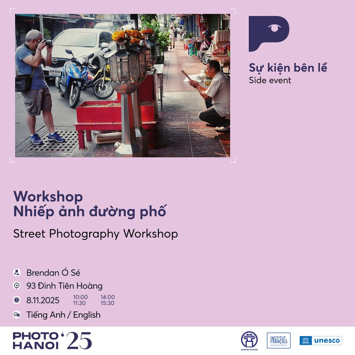 Song song với đó, Photo Hanoi ’25 cũng trân trọng giới thiệu hai buổi workshop đặc biệt từ nhiếp ảnh gia Ireland Brendan Ó Sé – gương mặt nổi bật của nhiếp ảnh đường phố và nhiếp ảnh iPhone. Diễn ra vào thứ Bảy ngày 08/11 tại Trung tâm triển lãm 93 Đinh Tiên Hoàng, workshop hướng dẫn các kỹ thuật chụp ảnh đường phố bằng điện thoại hoặc máy ảnh, đồng thời mở ra một buổi thực hành ngay tại khu vực phố Hoàn Kiếm. Người tham dự vừa học, vừa trải nghiệm nhịp chuyển động của thành phố qua lăng kính cá nhân, dưới sự dẫn dắt trực tiếp của một nghệ sĩ từng đoạt nhiều giải thưởng quốc tế.
