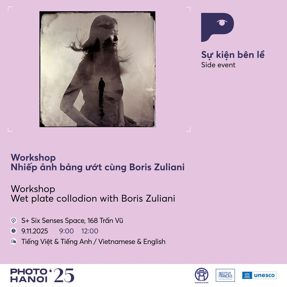 Ở workshop của Boris Zuliani, khán giả được làm quen với kỹ thuật wet plate – một quy trình thủ công từ thế kỷ 19. Dưới sự hướng dẫn trực tiếp của nghệ sĩ, người tham gia tự tay pha hóa chất, chuẩn bị đĩa ảnh và in ra bức ảnh cuối cùng, trải nghiệm sự chậm rãi và chính xác của nhiếp ảnh nguyên bản.