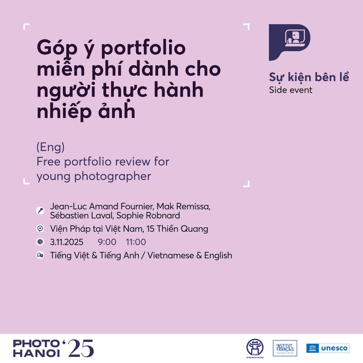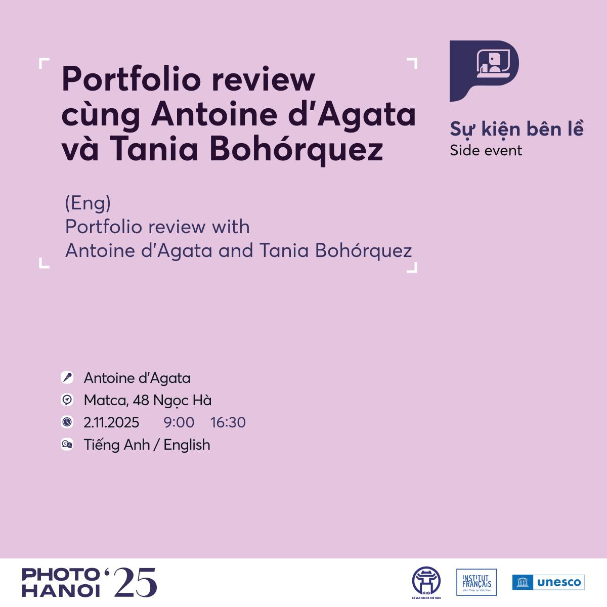Không gian cho nghệ sĩ trẻ được mở rộng qua các phiên portfolio review và sự kiện mở xưởng. Magnum Learn phối hợp cùng Viện Pháp và Matca tổ chức buổi review chuyên sâu với Antoine d’Agata và Tania Bohórquez dành cho tám nhiếp ảnh gia Việt Nam được chọn. Cùng lúc, phiên speed-review do Hanoi Grapevine tổ chức mang đến cơ hội trao đổi nhanh và hiệu quả giữa nghệ sĩ trẻ và chuyên gia quốc tế.
