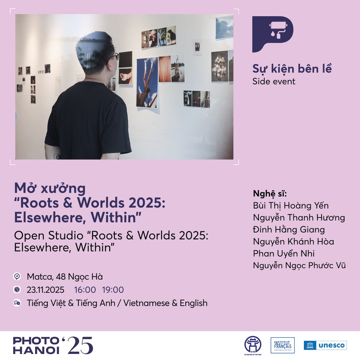 Tính thực hành tiếp tục được mở rộng trong sự kiện mở xưởng của chương trình Roots & Worlds 2025: Elsewhere, Within, nơi tác phẩm của học viên được trưng bày sau ba tháng làm việc với Eugénie Shinkle, Linh Phạm và Hà Đào trong môi trường thử nghiệm nhiếp ảnh chuyên sâu.
