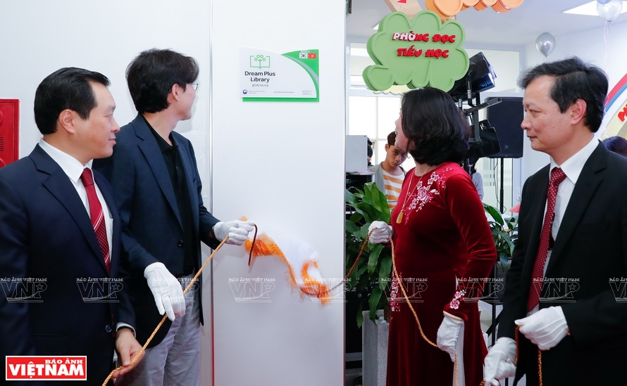 Các quan khách Hàn Quốc và Việt Nam cắt băng khánh thành không gian văn hóa cho trẻ em Thủ đô.