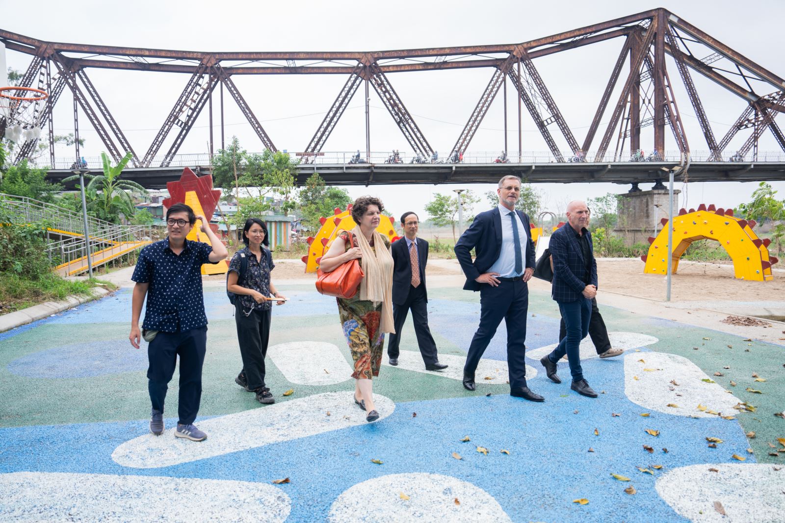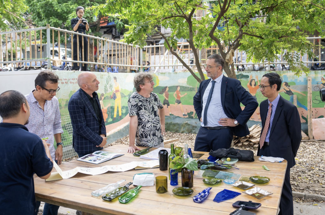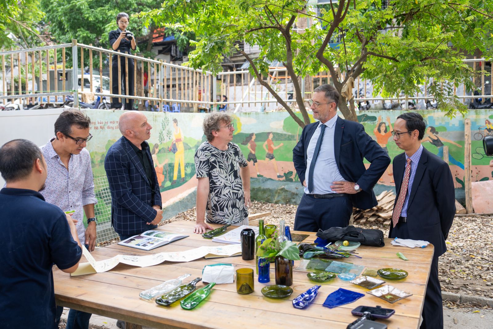 Nghệ sĩ Pháp Maxime Peroz giới thiệu tác phẩm của mình với các Đại sứ (Đại sứ Cộng hòa Liên bang Đức tại Việt Nam Helga Margarete Barth; Đại sứ Cộng hòa Pháp tại Việt Nam Olivier Brochet)