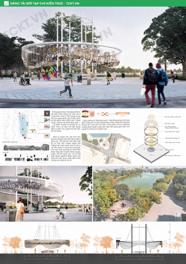 Inspired by the “Kéo quên lantern”, the façade of the design consists of 2 layers moving in opposite directions, making the layers and the images intertwine. “Kéo quân” depicts the appearance of the troop being in battle. It also conveys the message of the history and country. With this idea, the motifs on the façade of the work tell the story of the historical event on 10/ 10/ 1954 when the Hanoi army and people entered the Capital. From the outside, the image of the street and the people is placed in the back, standing out in the background is the image of the victorious soldiers marching through the 5 gates of the capital with the national flag fluttering in the wind. The layer with the idea of streets and people is arranged to rotate in the opposite direction to create the visual effects as if the people and the army are hugging each other, and the people welcome the returning soldiers.