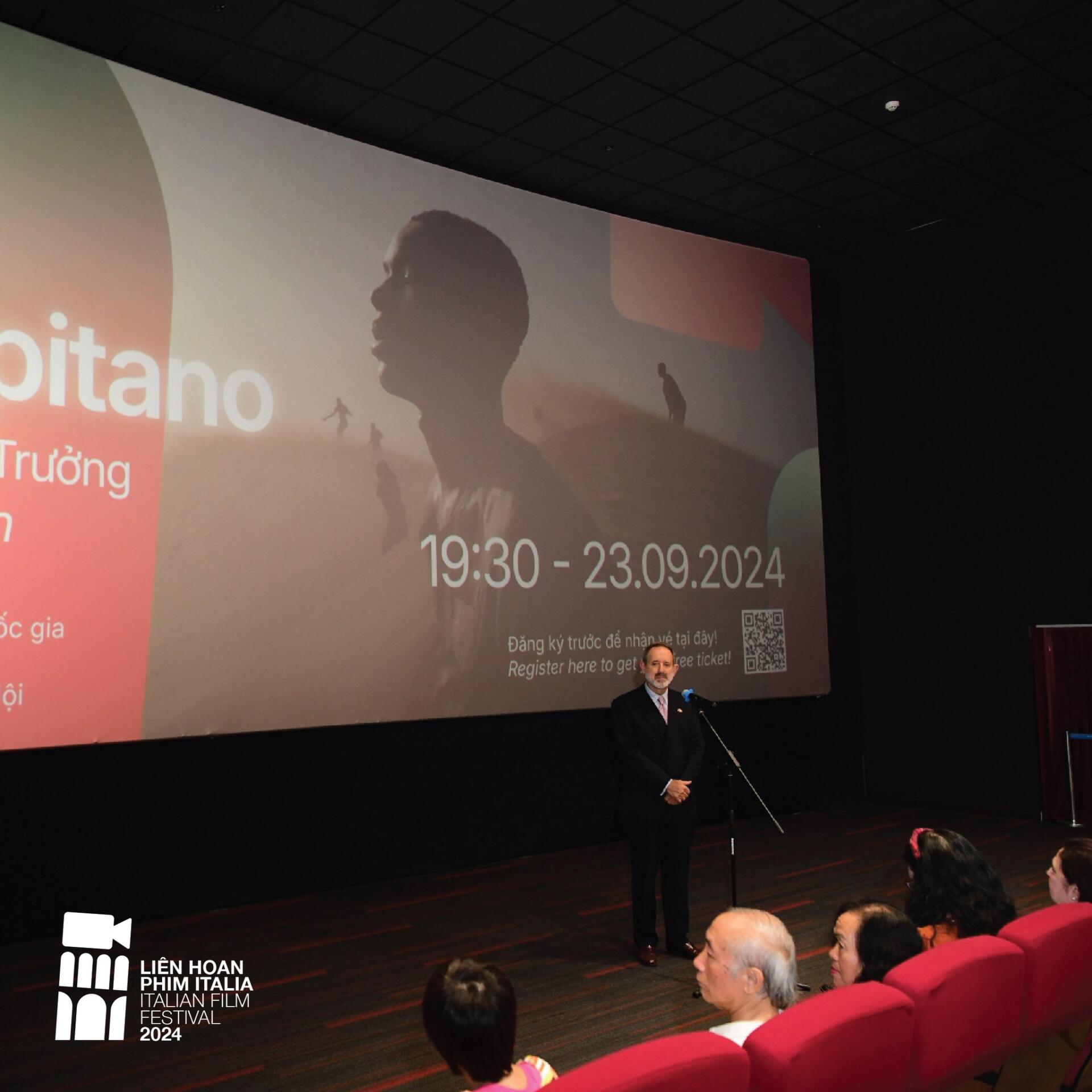 Tối ngày 23 tháng 09 năm 2024, Liên hoan phim Italia 2024 đã chính thức khai mạc thành công tại Trung tâm Chiếu phim Quốc gia (87 Láng Hạ, Hà Nội) với bộ phim “Io Capitano | Tôi là thuyền trưởng”. Buổi chiếu phim khai mạc có sự tham gia của ngài Marco della Seta – Đại sứ Italia tại Việt Nam; đạo diễn Antonio Termenini – Giám đốc Nghệ thuật của Liên hoan phim Italia 2024, cùng đông đảo khách mời là những đạo diễn, diễn viên, nhà báo, nhà phê bình và các khán giả yêu điện ảnh Italia.