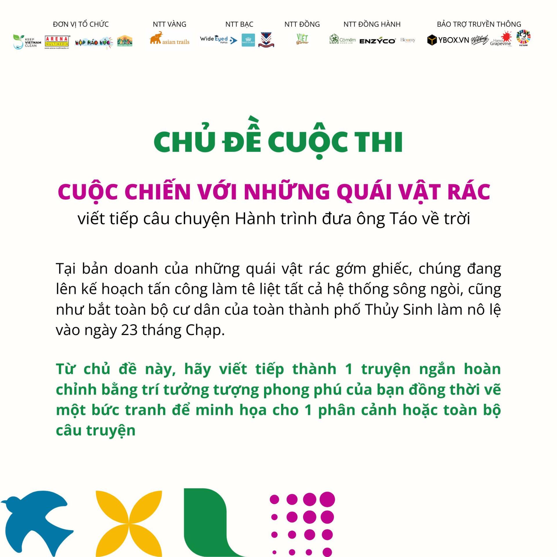 * Đối với truyện: tối thiểu từ 300 với lứa tuổi 5-10; từ 500 chữ với lứa tuổi 11-17 và 700 chữ với lứa tuổi trên 18. Hãy tưởng tượng và kể lại câu chuyện thật sáng tạo dựa trên bối cảnh trên, đảm bảo truyền tải đúng thông điệp cuộc thi. Khuyến khích cả gia đình/nhóm bạn cùng tham gia xây dựng câu chuyện.
