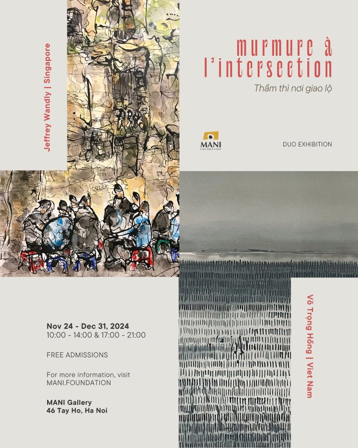 Với triển Lãm “Thầm Thì Nơi Giao Lộ” lần này, MANI Foundation muốn trưng bày bộ sưu tập tranh từ hai hoạ sĩ Jeffrey Wandly (Singapore) và Võ Trọng Hồng (Việt Nam) với những phố phường và cảnh quan từ Việt Nam sang đến Pháp, rồi từ Pháp lại trở về với Việt Nam. Đây là những tư liệu có ý nghĩa cá nhân rất lớn đối với bản thân người Hoạ sĩ, cũng là lăng kính để chúng ta hiểu thêm tâm tư và tình cảm của họ khi đi để mà đi, và đi, rồi lại “để trở về”!