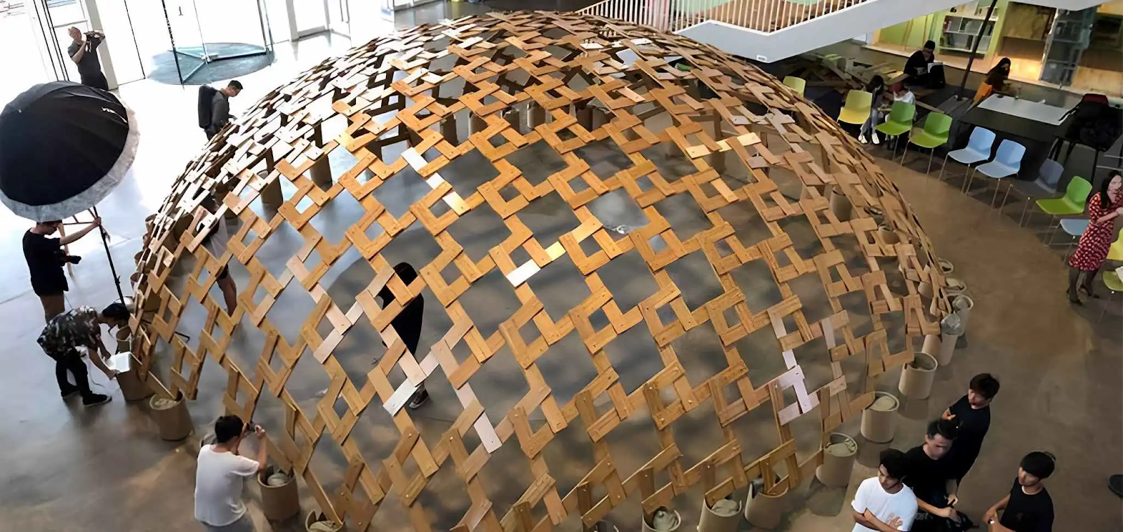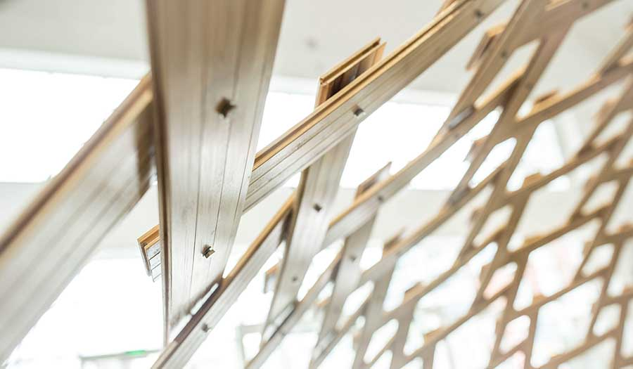 Điểm đột phá của thiết kế này nằm ở cách tiếp cận sáng tạo đối với cấu trúc tương hỗ. Các kiến trúc sư đã khéo léo sắp xếp các yếu tố liên kết có độ dài gấp đôi đơn vị lưới theo một mô hình hỗ trợ lẫn nhau. Nhờ đó, mỗi thành phần đều được kết nối bằng mộng và then, đảm bảo độ cứng uốn cong cho toàn bộ lưới.