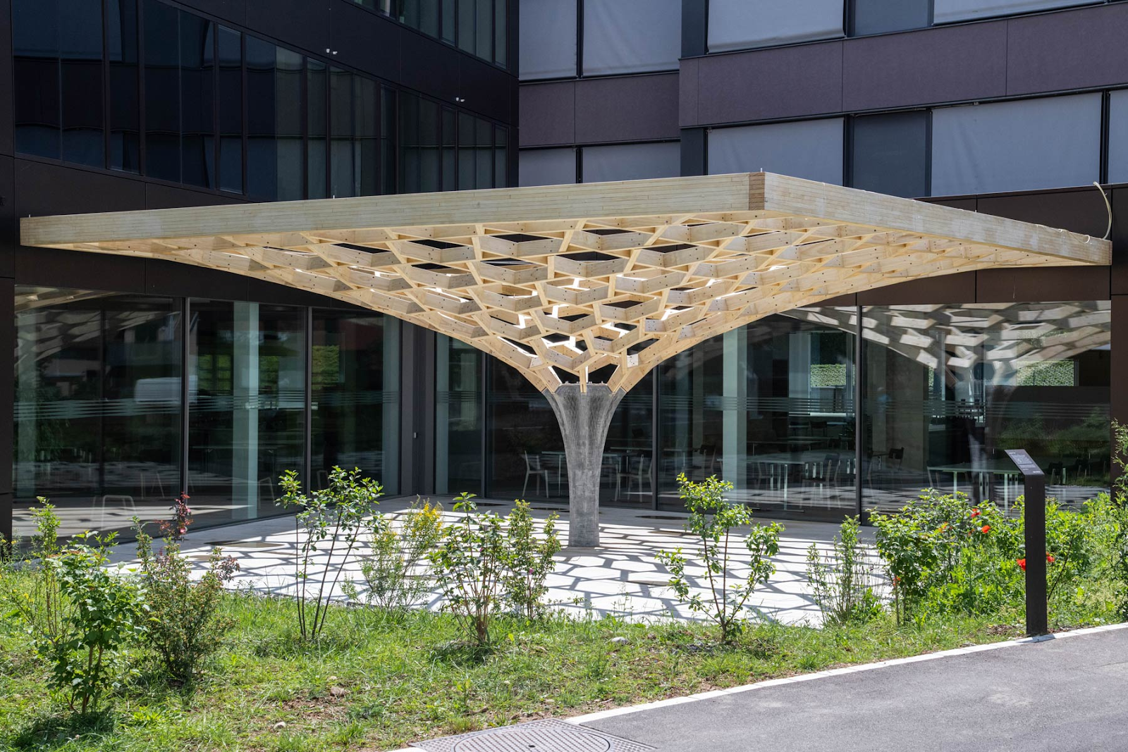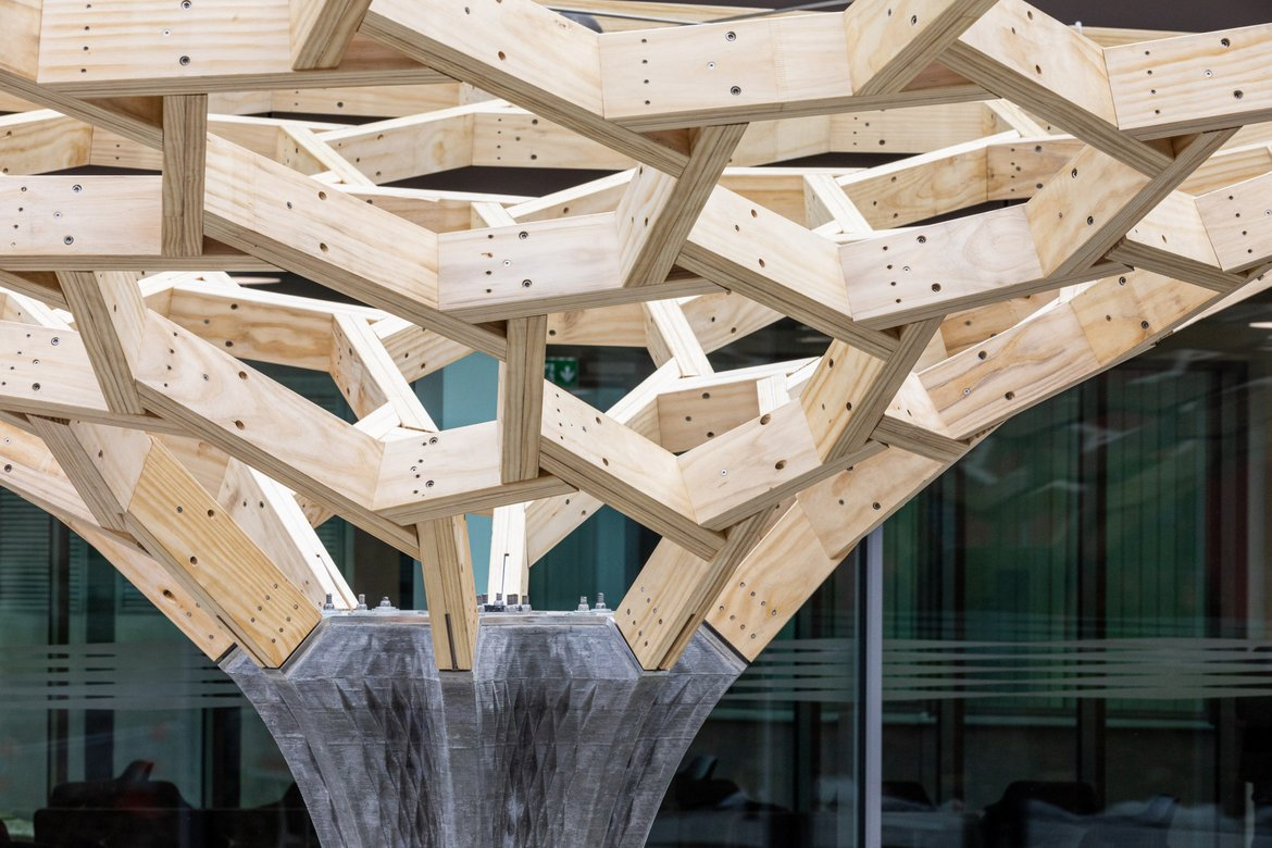Cấu trúc này được nâng đỡ bởi một cột bê tông trung tâm, với hai cạnh gắn vào tòa nhà chínhHình học của khung gỗ được tối ưu hóa để đạt hiệu suất cấu trúc tối đa. Đặc biệt, độ cứng của khung được điều chỉnh thông qua các lỗ mở nút đối ứng. Gỗ thông được lựa chọn làm vật liệu chính và được lắp ráp bằng ốc vít cùng cáp căng, thể hiện ứng dụng xuất sắc của công nghệ chế tạo robot trong xây dựng.