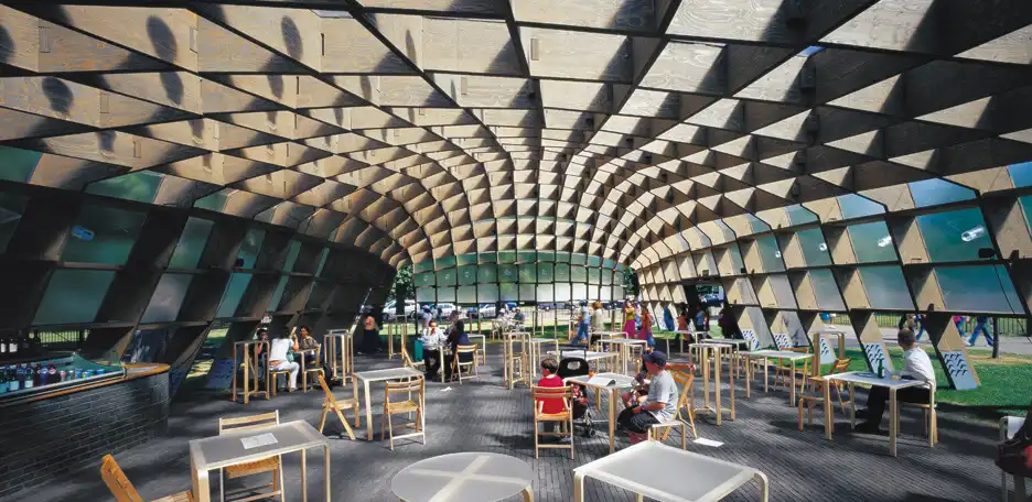 Tại Hyde Park, London, gian hàng triển lãm Serpentine Gallery hoàn thiện năm 2005 đã tạo nên một dấu ấn kiến trúc đáng chú ý. Được thiết kế bởi bộ ba kiến trúc sư Álvaro Siza, Eduardo Souto de Moura và Cecil Balmond, công trình nổi bật với cấu trúc lưới gỗ thông ghép lớp uốn cong độc đáo, trải rộng trên diện tích 400 mét vuông.
