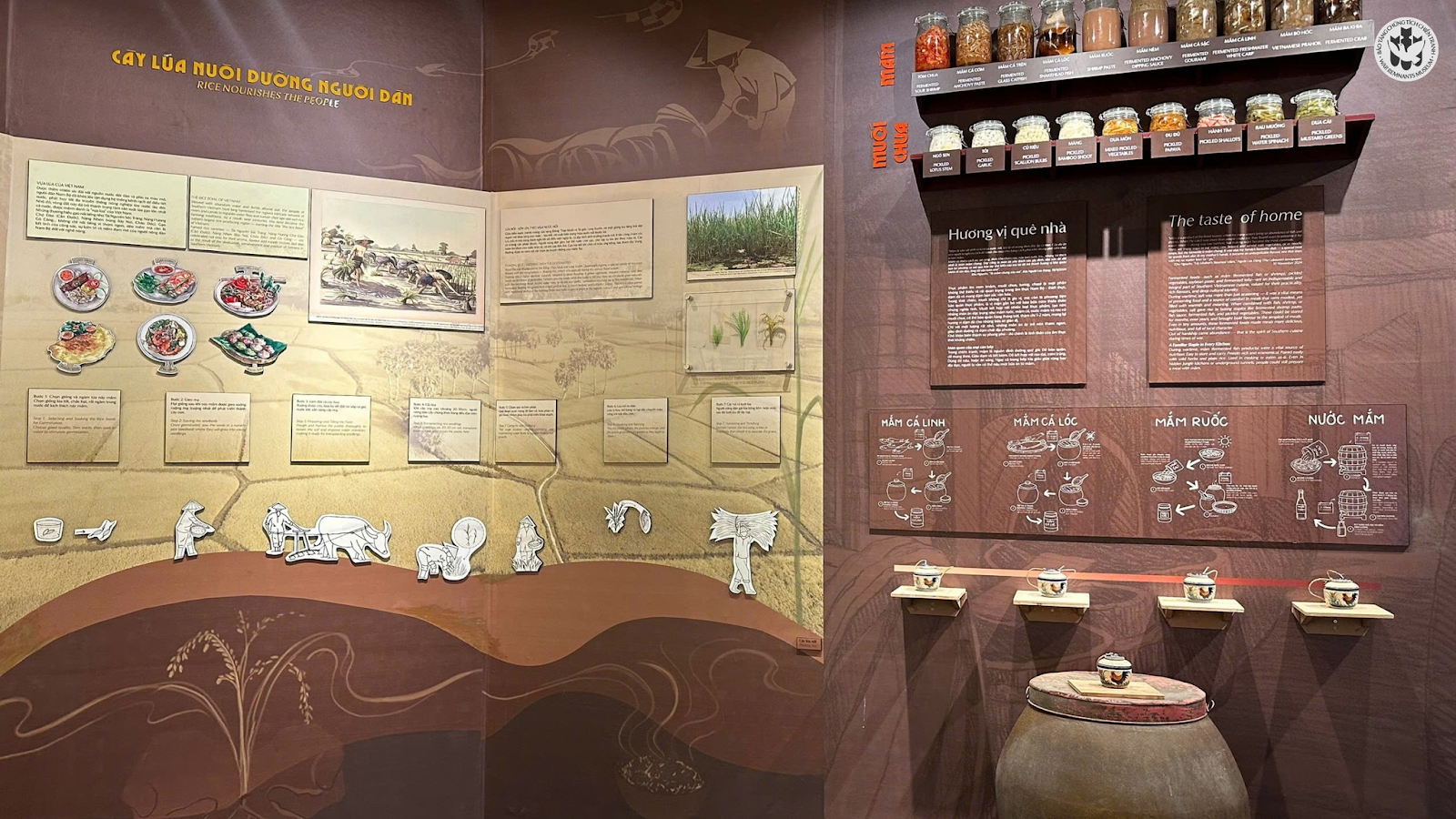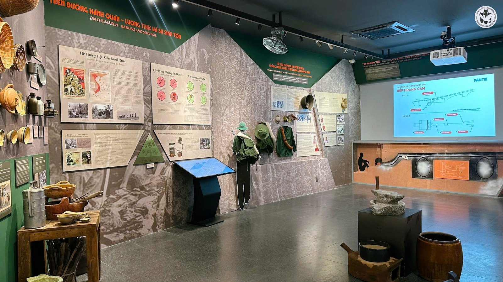 Không gian trưng bày tái hiện vật dụng thời bình và thời chiến, các loại gia vị và mắm đặc trưng Nam Bộ, cùng bản đồ ẩm thực vùng miền. Khách tham quan có thể trải nghiệm mô phỏng bếp Hoàng Cầm, quét mã QR để xem công thức cơm nắm, bánh ít, mắm chưng, hoặc tham gia hoạt động đóng dấu lá tre để tạo nên hình ảnh “rừng tre” – biểu tượng cho sự kiên cường và đoàn kết.