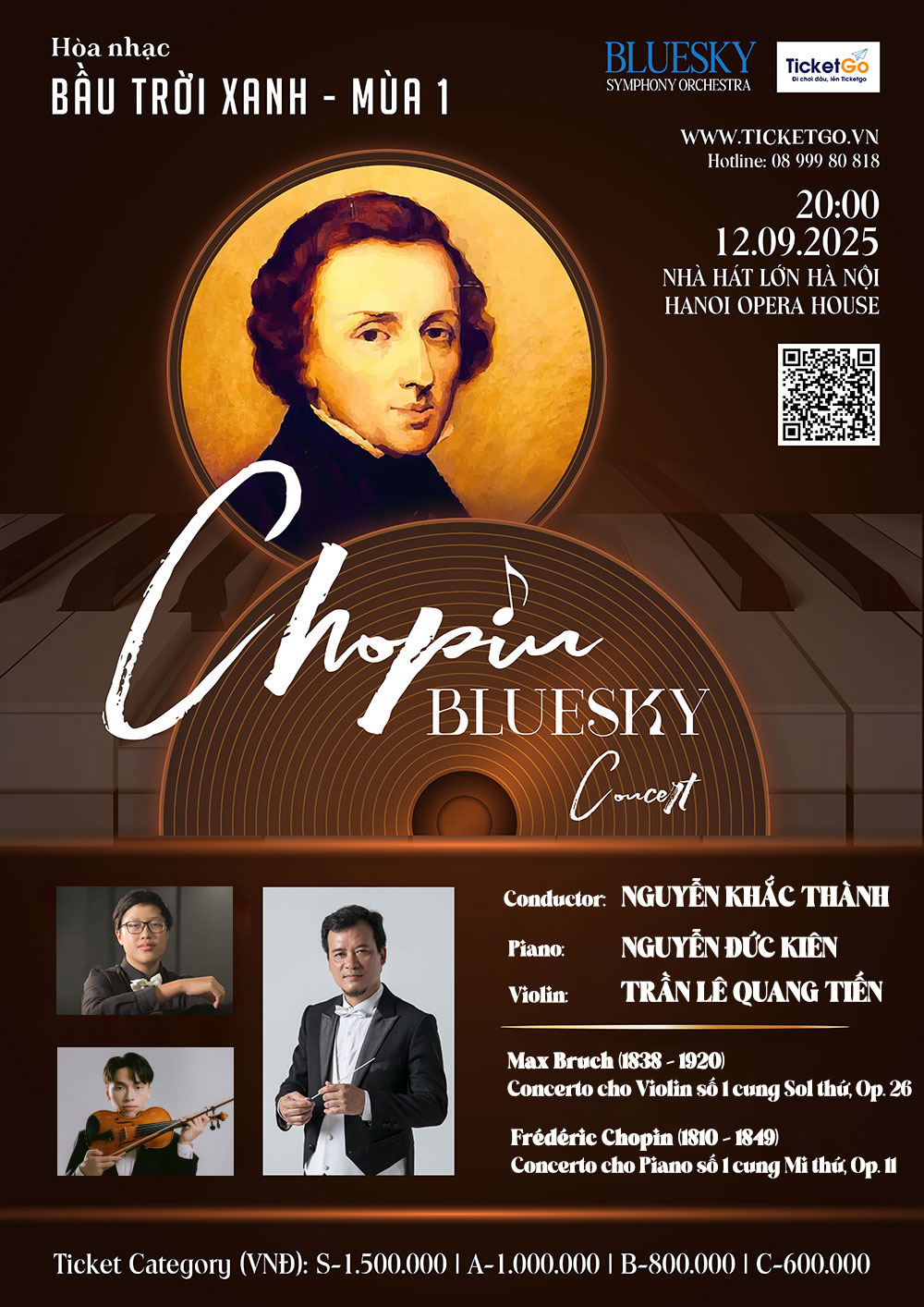 Dưới sự chỉ huy của nhạc trưởng Nguyễn Khắc Thành, Dàn nhạc Giao hưởng BLUESKY (BLUESKY Symphony Orchestra – BSSO) sẽ mang chương trình BLUESKY Season 1: Chopin đến với khán giả vào 20:00 ngày 12/ 09/ 2025 tại Nhà hát Lớn Hà Nội.