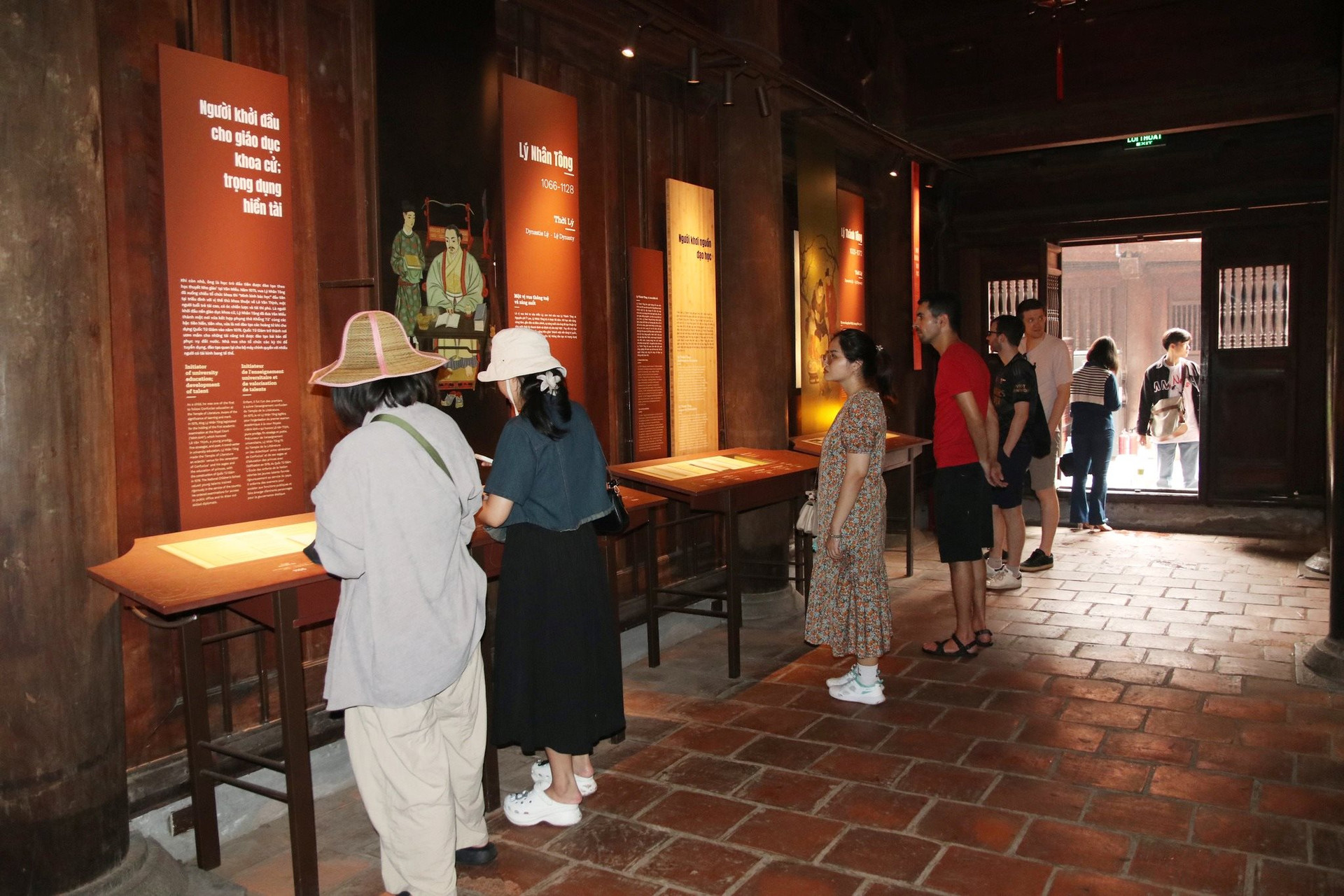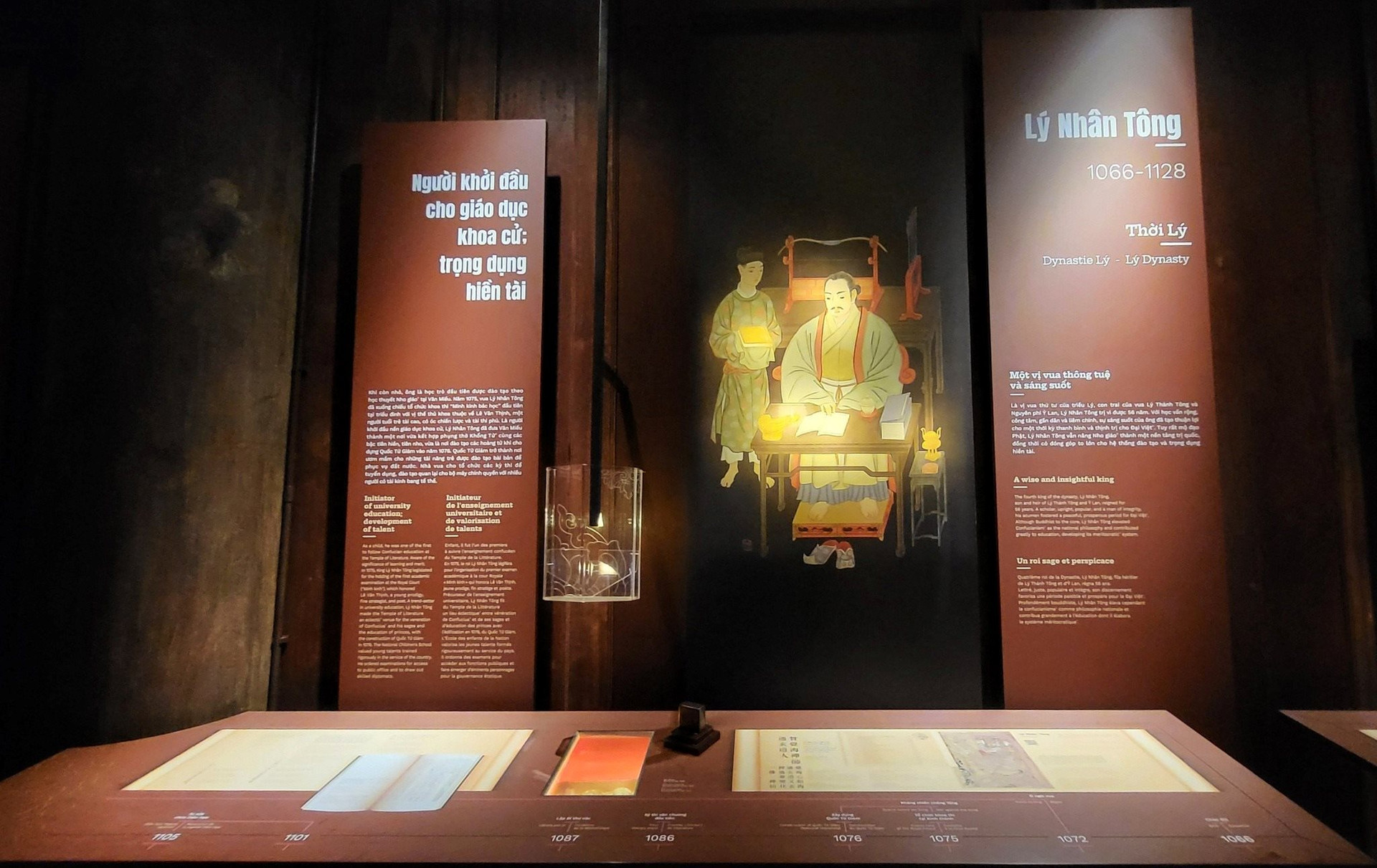 Trưng bày sử dụng hơn 300 tài liệu, hiện vật, chia làm bốn phần nội dung chính được giới thiệu theo dòng lịch sử để tái hiện lại cuộc đời và những đóng góp của các Vua Lý Thánh Tông, Lý Nhân Tông, Lê Thánh Tông và thầy giáo Chu Văn An cùng những người có tầm ảnh hưởng như: Nguyên phi Ỷ Lan, danh nhân khoa bảng Lê Văn Thịnh, Lương Thế Vinh…