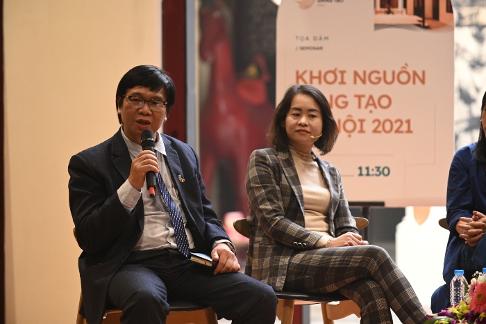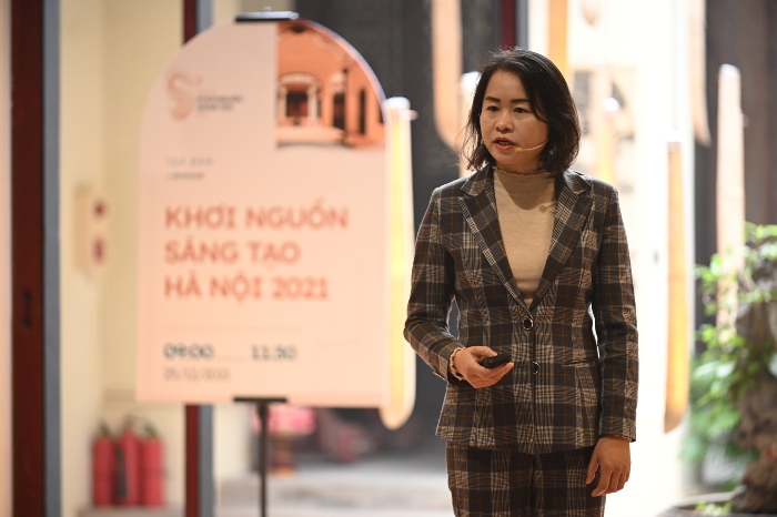 Bà Phạm Thị Lan Anh bắt đầu tọa đàm bằng tham luận “Hà Nội và tiềm năng xây dựng Thành phố sáng tạo từ nguồn lực văn hoá”. Chúng ta biết rằng Hà Nội là một thành phố giàu di sản và bề dày văn hóa lịch sử. Cơ cấu dân số vàng với hơn 51% dân số trong độ tuổi sáng tạo. Việc phát triển Hà Nội trở thành Thành phố sáng tạo được thành phố hết sức quan tâm. Trong văn kiện Đại hội đại biểu Đảng bộ thành phố Hà Nội lần thứ XVII đã đề ra mục tiêu tổng quát: Đến năm 2025 phát triển nhanh và bền vững Thủ đô theo hướng đô thị xanh, thành phố thông minh, hiện đại có sức cạnh tranh cao trong nước và khu vực, Đến năm 2045, Hà Nội có chất lượng cuộc sống cao; kinh tế, văn hoá, xã hội phát triển toàn diện, bền vững, là thành phố kết nối toàn cầu có sức cạnh tranh quốc tế.