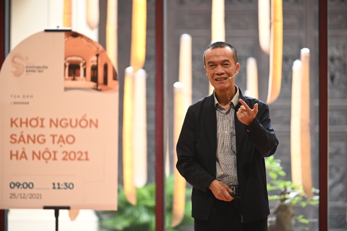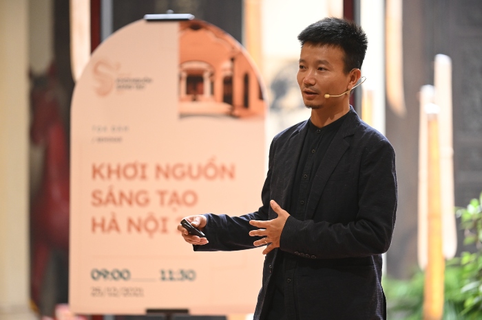 THS.KTS Nguyễn Duy Thanh đặt vấn đề: “Không gian sáng tạo và vai trò của giới Kiến trúc sư”. Anh điểm mặt các “điểm sáng” kiến trúc, các không gian sáng tạo thành công trong thời gian qua, như: Zone 9, AGO Hub, 282 workshop, Complex 01, Id Hub, Think Playgrounds và gần đây nhất là Trung tâm tinh hoa làng nghề Việt – Bát Tràng. Thực trạng hiện nay, các điểm sáng này đang hoạt động một cách đơn lẻ với sức phục vụ hạn chế chỉ 1000 – 5000 lượt người/năm trong khi dân số Hà Nội đã lên đến con số 10 triệu người. Vấn đề đặt ra làm sao để kết nối các nguồn lực để tạo ra không gian phục vụ nhiều người hơn nữa. Cộng hưởng để cùng tỏa sáng.