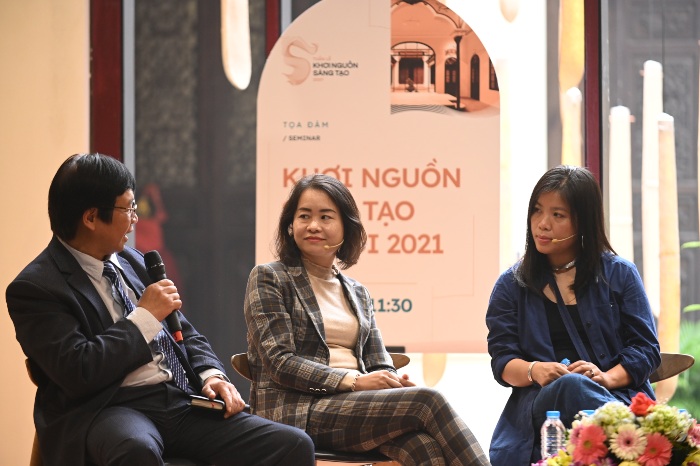 Phần cuối của buổi tọa đàm, TS.KTS Nguyễn Quang đặt câu hỏi cho từng diễn giả để làm rõ hơn các luận điểm và tính kết nối giữa các bên, như đã đề cập trong toạ đàm: Nhà nước – Tư nhân và các Tổ chức quốc tế. Từ khoá được nhắc đến nhiều nhất trong buổi hỏi đáp này chính là “kết nối” để đưa ra các hành động cụ thể, nhuần nhuyễn từ việc thành phố Hà Nội chủ động tạo ra môi trường thể chế chính sách thúc đẩy hệ sinh thái sáng tạo, đến các xu thế tự nảy sinh từ kết nối trong cộng đồng tạo ra giá trị văn hoá mới. Phát triển song song không gian sáng tạo gắn liền với văn hoá bản địa và gắn liền với các trường đại học, giới hàn lâm. Thúc đẩy kết nối giữa các cá nhân, các tập thể nhỏ lẻ, các đối tượng hoạt động chính và mạnh mẽ nhất trong ngành sáng tạo. Tuy nhiên, tầm nhìn cần hướng tới nhóm các tập đoàn, những gã khổng lồ, để lan tỏa các trị ở diện rộng hơn nữa.