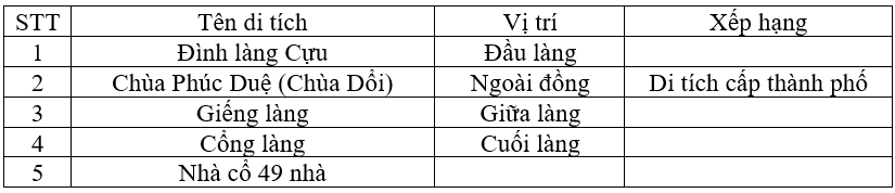 Bảng thống kê di sản kiến trúc, công trình xây dựng làng Cựu