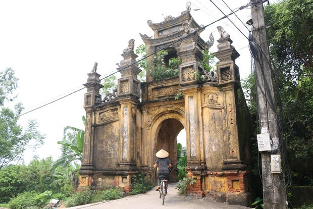 Chiếc cổng làng bề thế là kiến trúc cổ cao nhất ở làng Cựu, được xây theo lối “quyển thư”, tựa như một cuốn sách khổng lồ đang mở ra đón khách. Cổng làng có kiến trúc cầu kỳ, bề thế, có tầng, có mái và có cả lối lên xuống. Vọng các của cổng làng với mái ngói, bờ đao cong vút, hai đôi nghê đắp nổi dù đã sứt mẻ theo thời gian nhưng vẫn còn nguyên nét đẹp cổ kính, thể hiện sự bề thế của một ngôi làng trù phú.