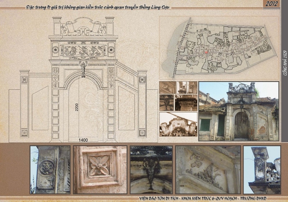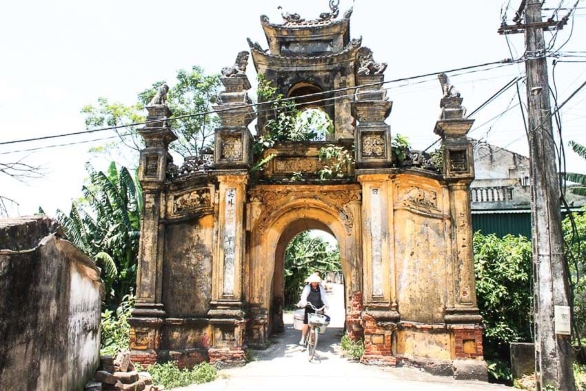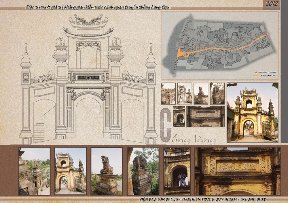 Một yếu tố quan trọng tạo nên không gian cảnh quan đường làng là sự đa dạng trong kiến trúc cổng. Từ cổng mang phong cách của kiến trúc cổ Việt nam như cổng tại nhà cụ phó Du – nhà vị quan chức trong làng, một trong những ngôi nhà cổ nhất của làng xây năm 1929 nằm ở đầu làng. Đến cổng nhà mang phong cách kiến trúc Trung Hoa (cổng phụ) nằm phía nam đường chính. Cổng ở khu vực giữa làng là sự kết hợp của các chi tiết kiến trúc Việt nam– Trung Quốc – Châu Âu.