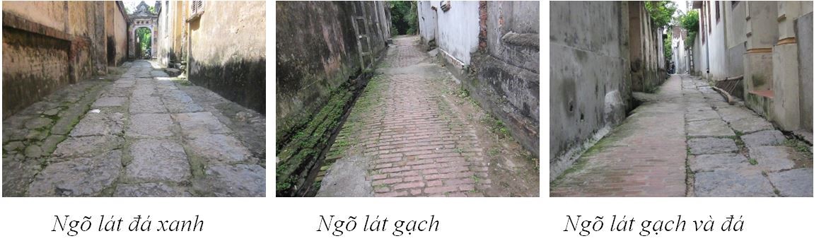 Không gian cảnh quan tuyến ngõ xóm được nhận diện thông qua vật liệu lát ngõ, hệ thống rãnh thoát nước, ranh giới giữa khuôn viên nhà và không gian ngõ, tỷ lệ giữa chiều rộng ngõ và bình diện đứng 2 bên (tường rào), không gian kết thúc tuyến ngõ