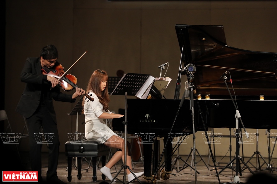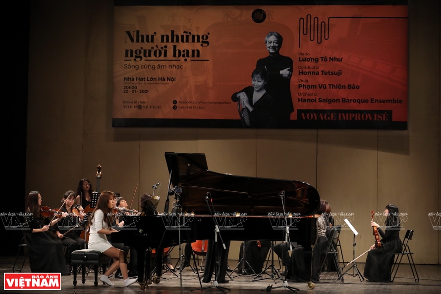 Nghệ sĩ piano Lương Tố Như biểu diễn cùng nghệ sĩ Viola Phạm Vũ Thiên Bảo trong đêm nhạc “Như những người bạn” diễn ra tại Nhà hát Lớn Hà Nội.