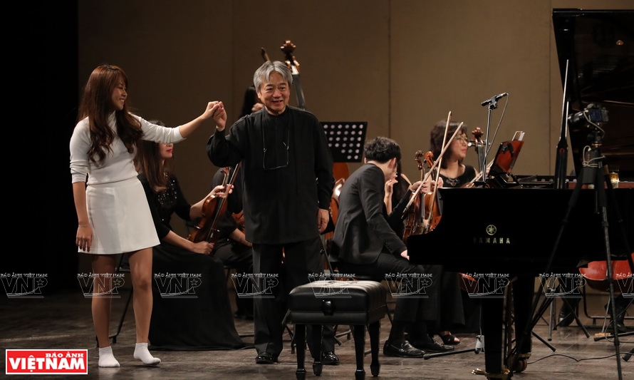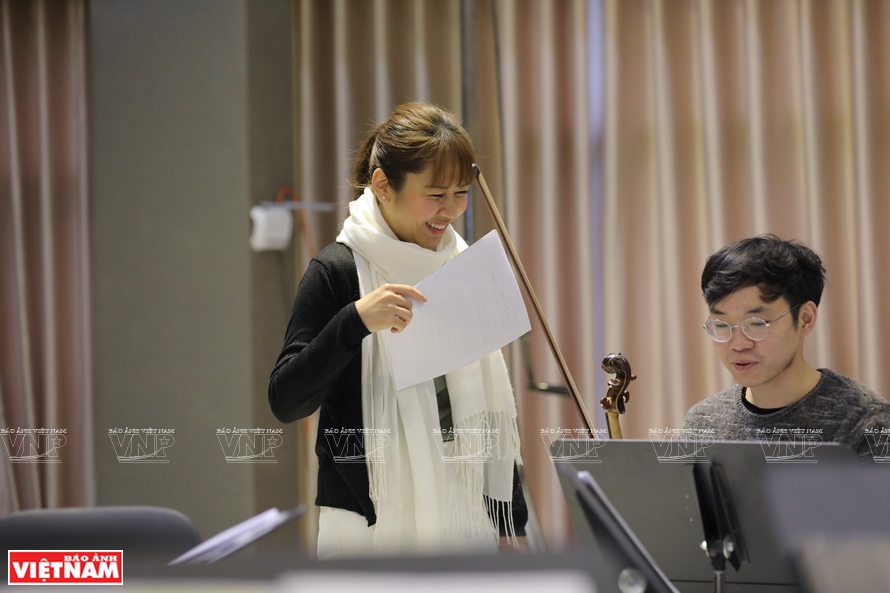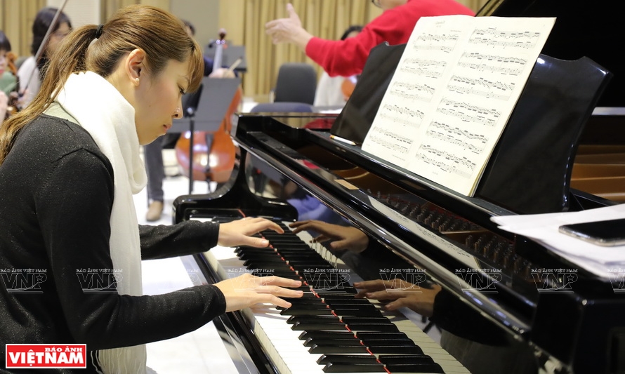 Nghệ sĩ piano Lương Tố Như tập luyện cho buổi diễn với dàn nhạc Hanoi Saigon Baroque Ensemble cùng nhạc trưởng Honna Tetsuji.