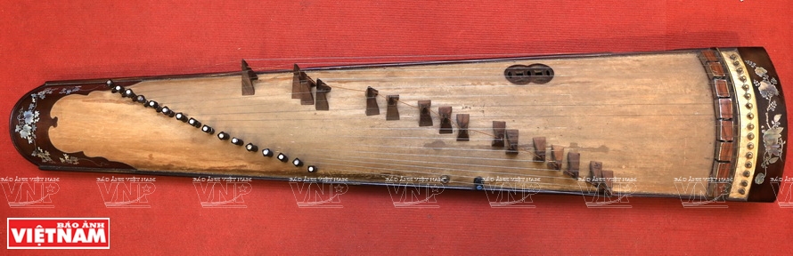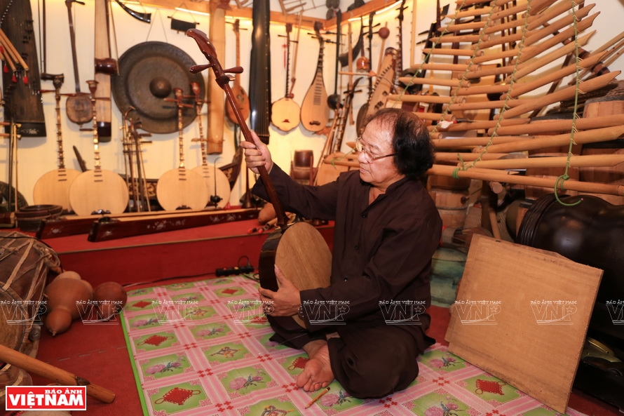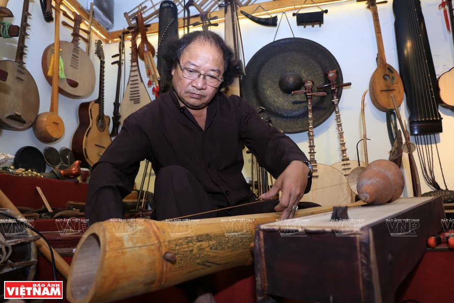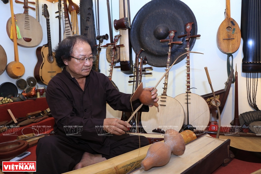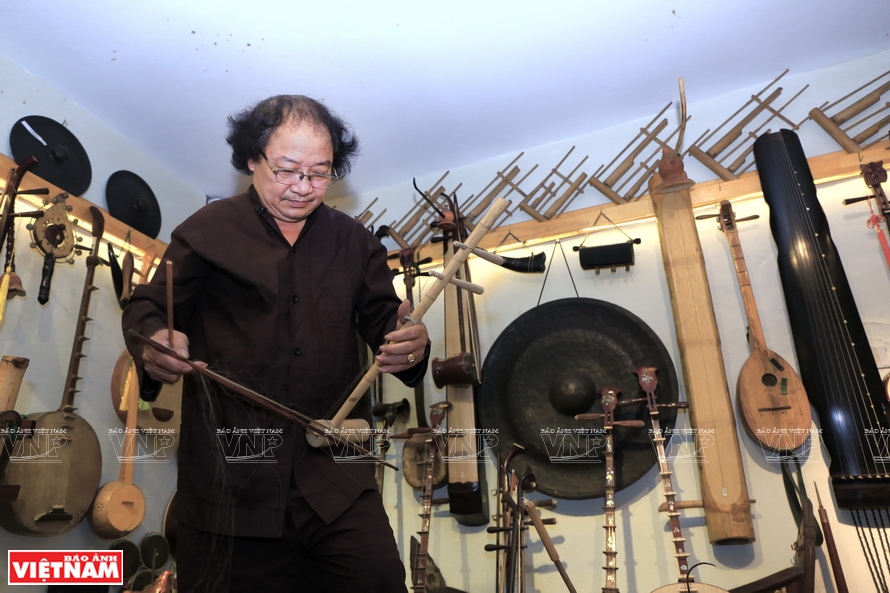![]() Nghệ sỹ Phạm Chí Khánh đang chơi đàn trong không gian trưng bày nhạc cụ của mình.