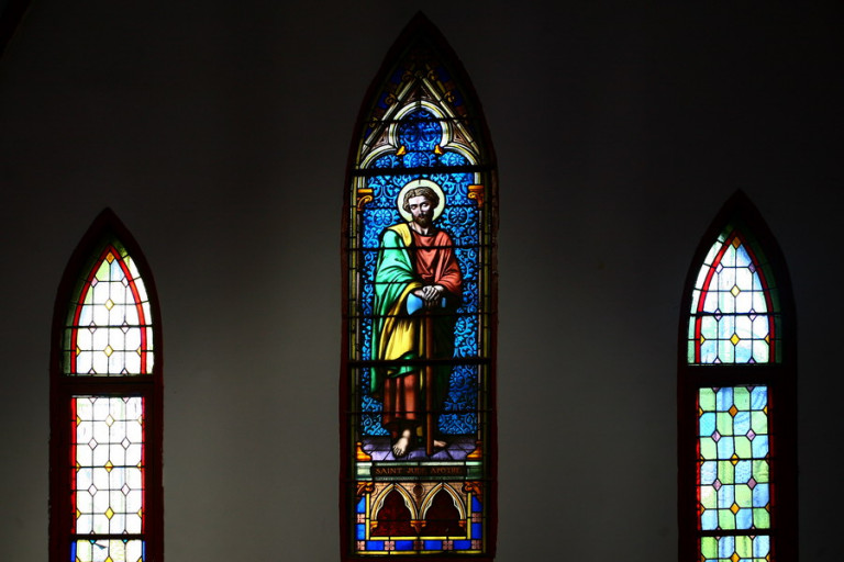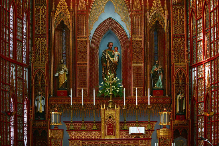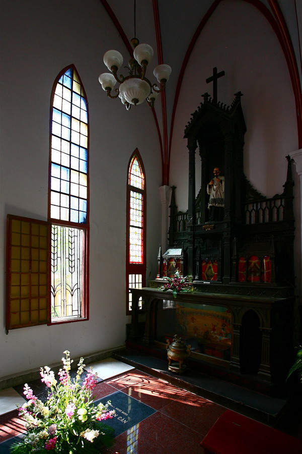Khu vực cung thánh ở cuối cùng và các ban thờ được trang trí bằng gỗ chạm trổ hoa văn sơn son thiếp vàng có tính nghệ thuật dân gian truyền thống hết sức độc đáo. Cung thánh nằm chính giữa có hình bán nguyệt là ban thờ Thánh Giuse, hai bên có ban thờ Thánh Alton và ban thờ các Thánh tử vì đạo. Tại ban thờ Thánh Giuse, có bức tượng Thánh cao hơn 2m; phía trên là những ô cửa kính màu lớn bố trí theo mặt bằng vòng cung. Ở giữa phần không gian hành lễ, nằm về hai phía còn có ban thờ Đức Mẹ và ban thờ “Lái tim chúa Giesu”. Các ban thờ này đều có tranh trí nội thất thống nhất với nhau bằng chất liệu gỗ, kết hợp với các ô cửa kính màu.