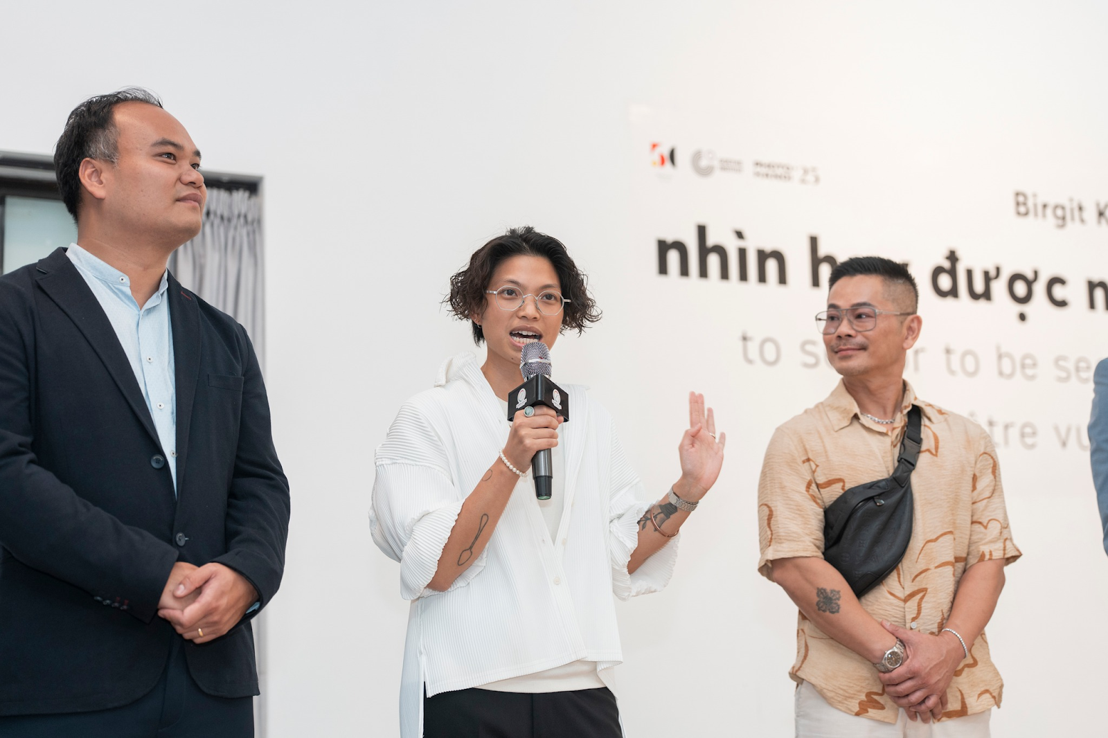 Birget Kleber cùng các nhân vật xuất hiện trong 2 loạt ảnh và ông Franck Bolgiani – Giám đốc Viện Pháp tại Hà Nội trong Buổi Khai mạc (Ảnh: BTC)