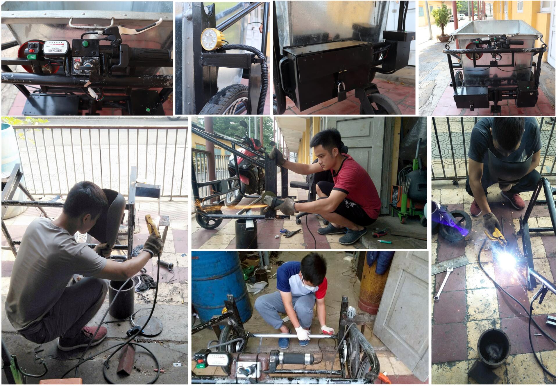 Với sự hướng dẫn và giúp đỡ của PGS.TS Nguyễn Thế Lương, sau gần một năm thực hiện dự án, nhóm đã chế tạo thành công xe đẩy rác bằng điện. Trưởng nhóm Nguyễn Tiên Tiến cho biết, chiếc xe này chỉ cần vặn tay ga là có thể đi, không phải đẩy như xe rác hiện nay.