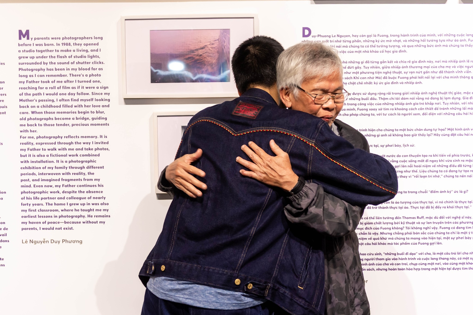 Lê Nguyễn Duy Phương và cái ôm với Ba trong Lễ Khai mạc Triển lãm (Ảnh: Trần Ngọc Sơn)