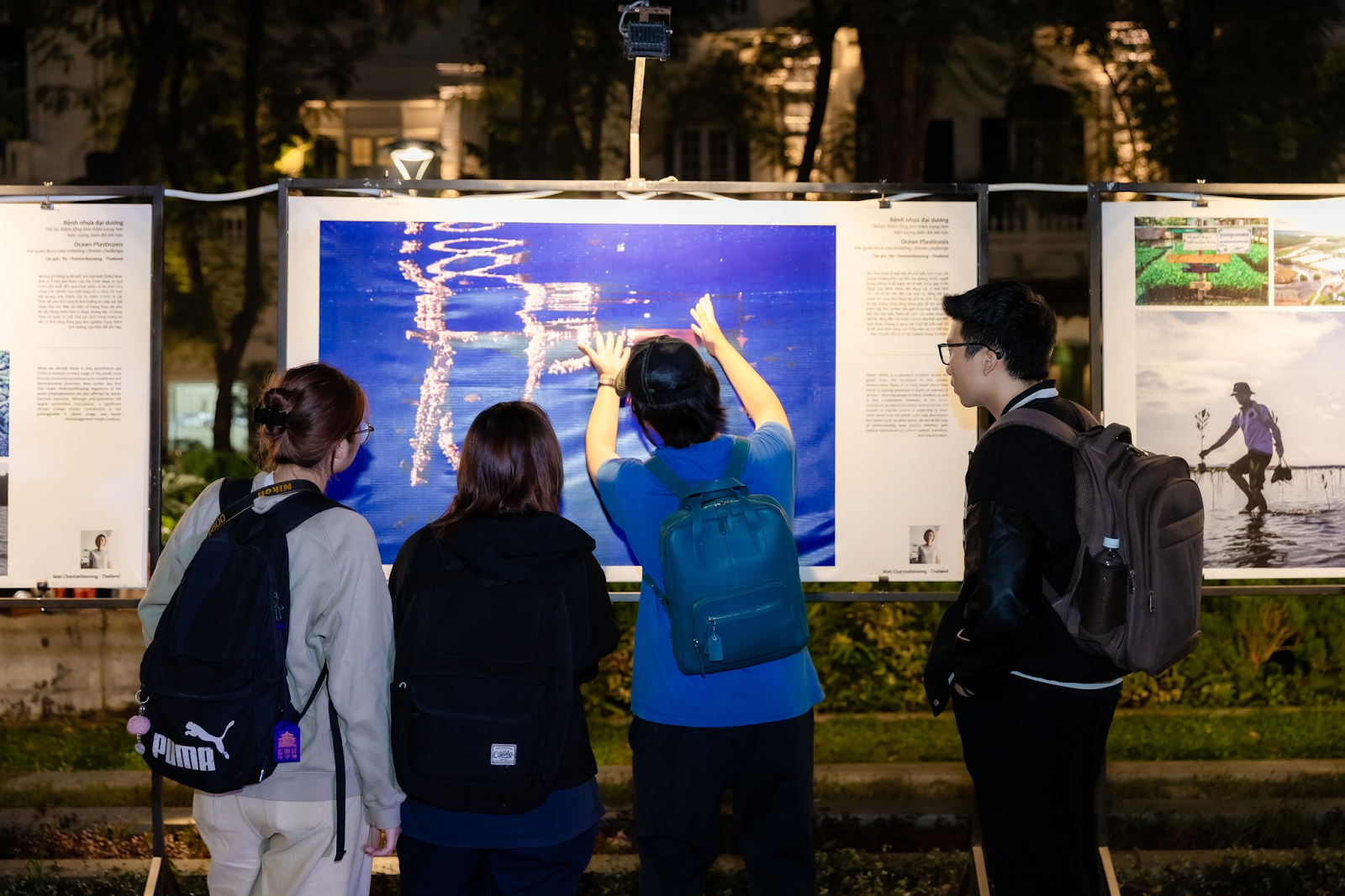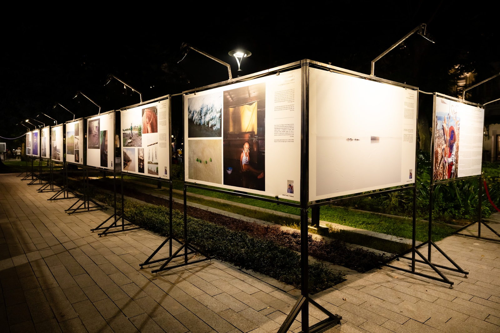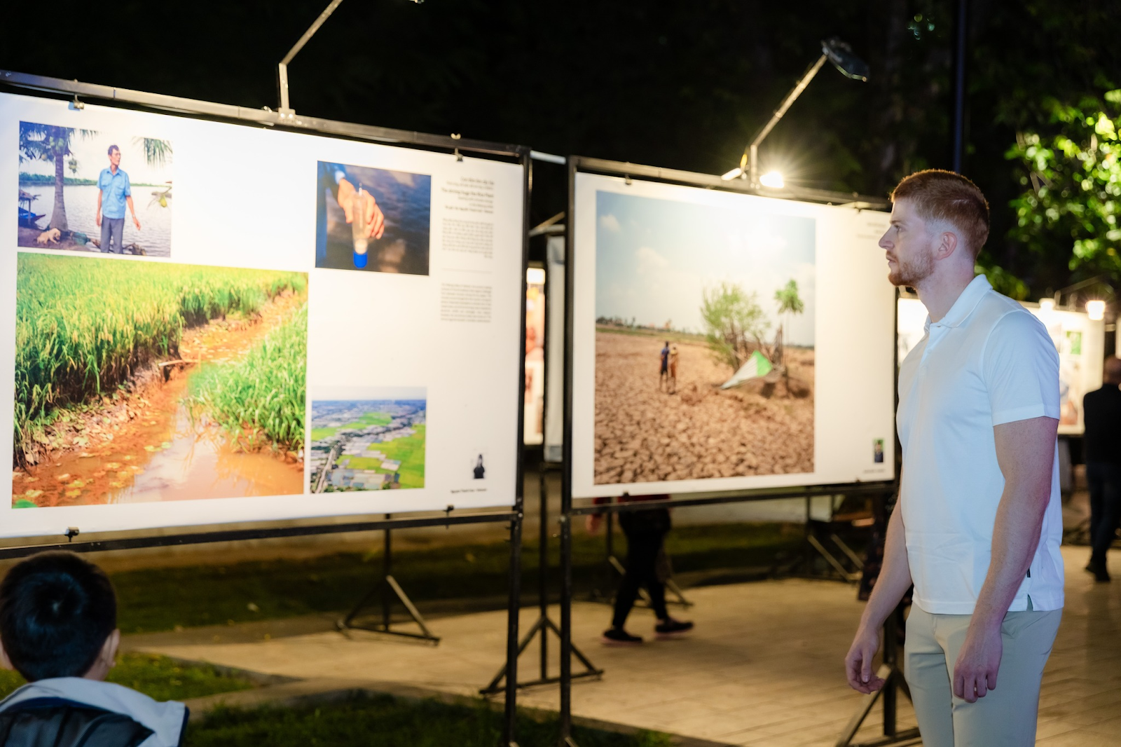 “Biến đổi khí hậu trông như thế nào thông qua lăng kính đời sống thường nhật của con người?” – Câu hỏi tưởng chừng đơn giản ấy chính là điểm khởi đầu cho triển lãm “Những khung hình về Biến đổi Khí hậu”. Hành trình của triển lãm đưa người xem đi qua nhiều lớp cảnh quan và câu chuyện. Có tác phẩm theo dõi những ảnh hưởng từ quá trình axít hóa đại dương, có tác phẩm khắc họa đời sống con người đang quen dần với nắng nóng cực đoan. Tại vùng ven biển Campuchia, rừng ngập mặn bị tàn phá nhưng nỗ lực tái trồng vẫn diễn ra để duy trì hệ sinh thái. Ở Đồng bằng sông Cửu Long, mô hình tôm lúa mở ra triển vọng giúp cộng đồng địa phương thích ứng với thay đổi khí hậu.