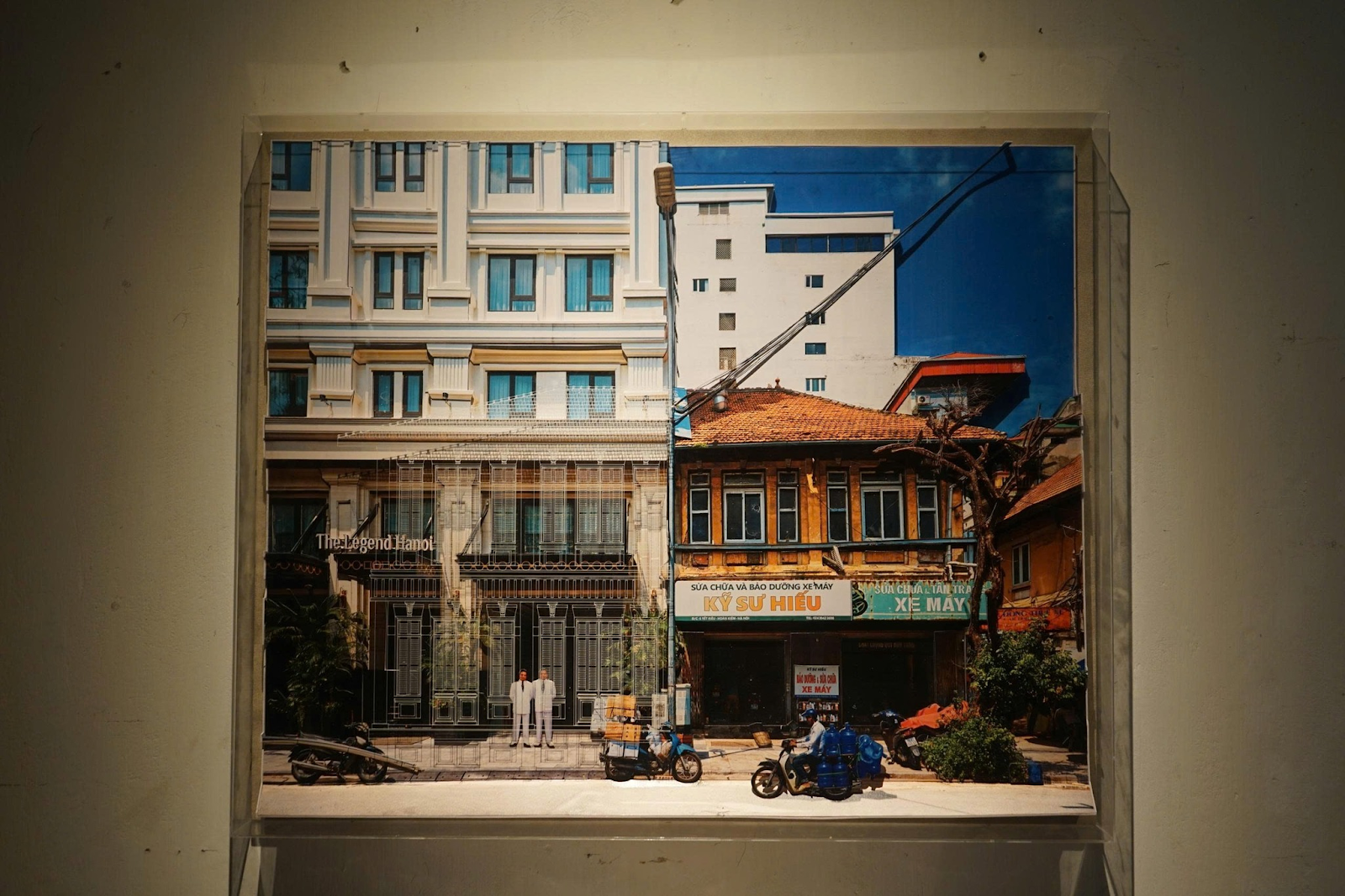 Thế Sơn sử dụng nhiếp ảnh phù điêu kết hợp khắc laser trên mica để phục dựng hình dáng nguyên bản của các biệt thự dựa trên bản vẽ và tư liệu quy hoạch thời Pháp. Ánh sáng được xử lý tạo độ sâu vật chất, khiến từng mái ngói, ô cửa và hoa văn hiện lên rõ nét, gợi cảm giác đối thoại giữa quá khứ và hiện tại.