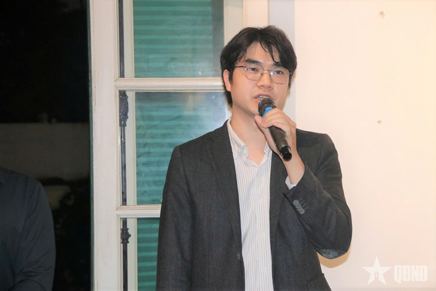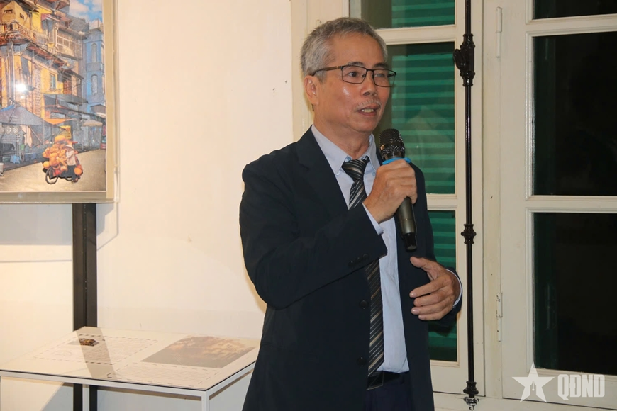 Nhà nghiên cứu Phạm Minh Quân (Trường Khoa học liên ngành và Nghệ thuật, Đại học Quốc gia Hà Nội) chia sẻ tại buổi khai mạc triển lãm (Ảnh: Quân đội nhân dân)