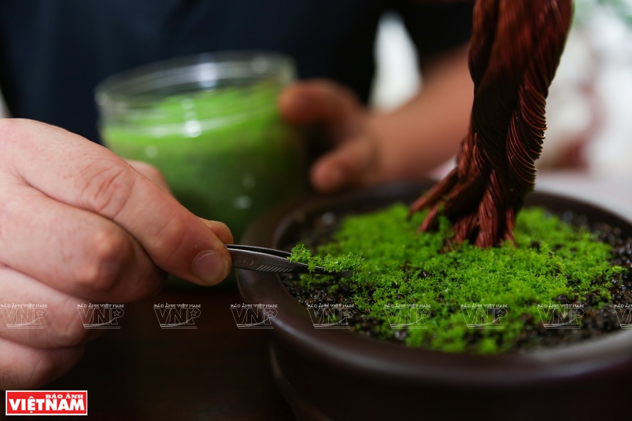 Sau khi đã có phôi cây, anh Doanh sẽ gắn phôi vào chậu rồi ghép lá. Trung bình một tiếng nếu làm nhanh sẽ được khoảng 60 lá. Khác với phôi cây, lá cây được sử dụng với những màu sắc khác nhau khiến cho tác phẩm thêm bắt mắt. Sau khi đã ghép xong lá thì sẽ trang trí thêm phần rêu và đá để giống tiểu cảnh bonsai. Để giữ màu cây tốt và không bị phai thì thường anh Doanh sẽ sơn thêm một lớp mỏng và đem phơi khoảng 1,2 ngày là hoàn thành một tác phẩm nghệ thuật bonsai độc đáo.