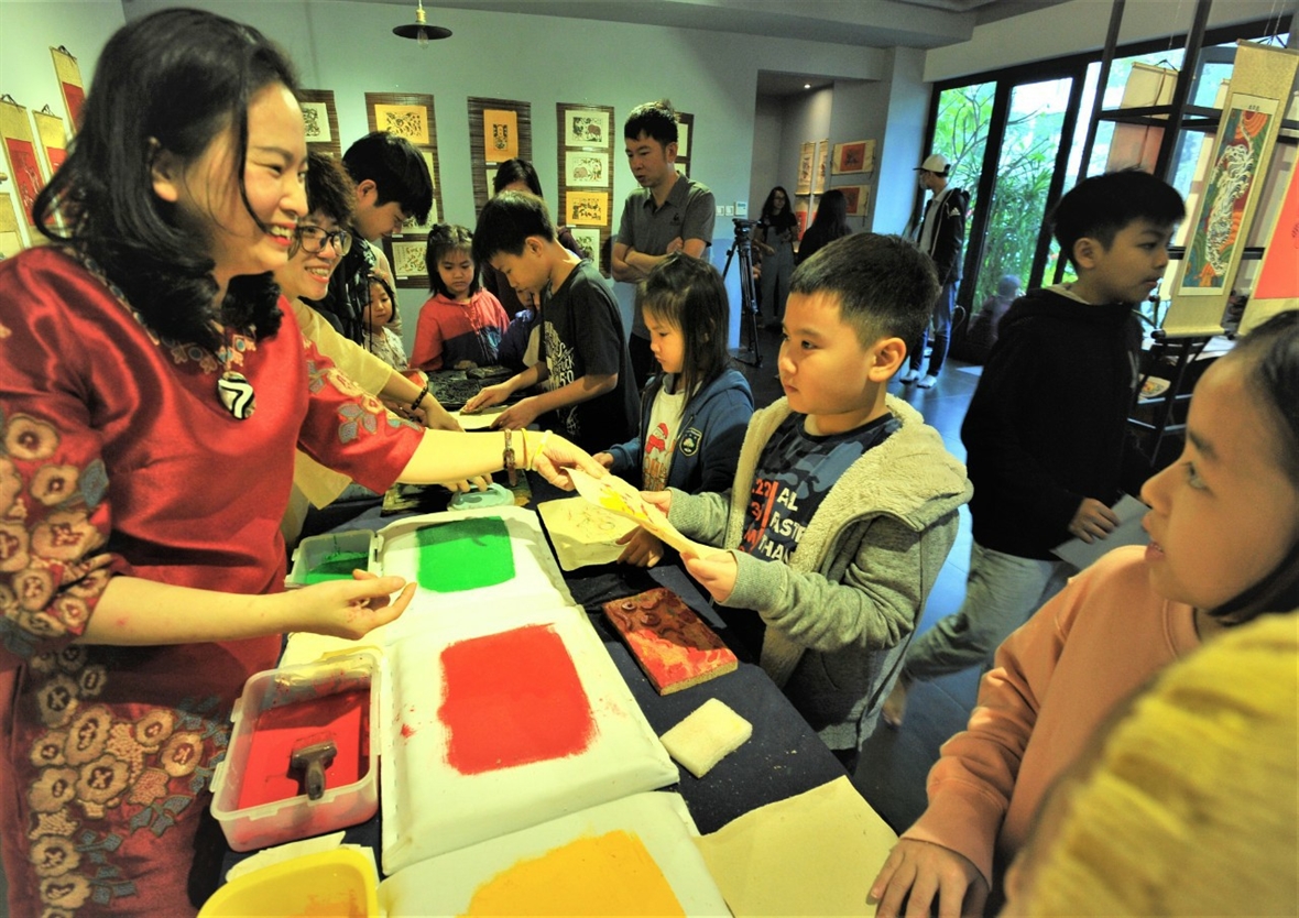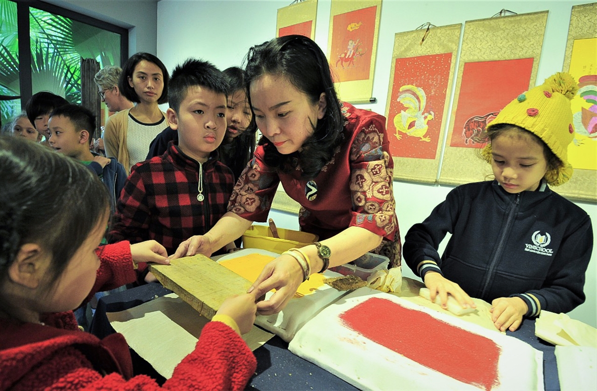 ![]() Theo PGS Trang Thanh Hiền, Việt Nam là đất nước có truyền thống Phật giáo lâu đời. Nghiên cứu về Phật giáo có khá nhiều mảng như tư tưởng, lịch sử… nhưng nghiên cứu về nghệ thuật, mỹ thuật thì đây là một mảng trống khá lớn. Ảnh: NVCC ![]() PGS Trang Thanh Hiền đang hướng dẫn các em nhỏ cách in dòng trang Kim Hoàng tại triển lãm về tranh dân gian. Ảnh: NVCC