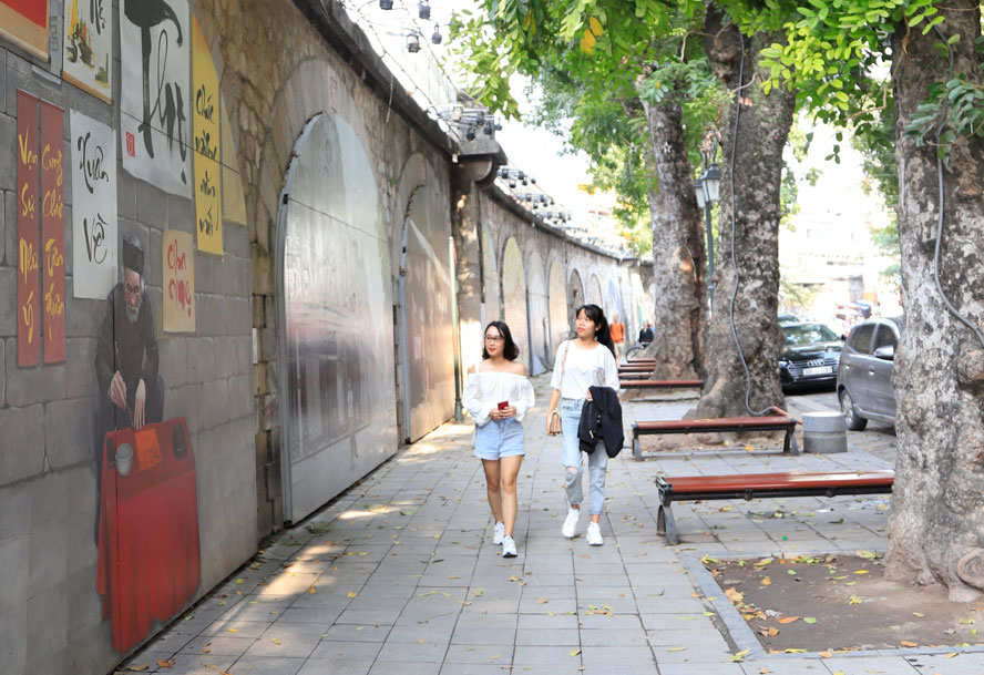 Hà Nội đã triển khai nhiều biện pháp để bảo tồn, phát huy giá trị di sản phố cổ, góp phần phát triển du lịch. Trong ảnh: Du khách tham quan phố bích họa Phùng Hưng (quận Hoàn Kiếm). Ảnh: Nguyễn Quang