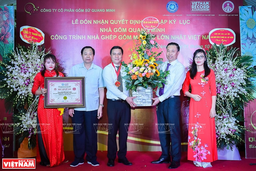 | Đến làng Bát Tràng, du khách sẽ rất thú vị khi được khám phá ngôi nhà Gốm kỷ lục Việt Nam với 3 triệu viên gốm ghép thành những tác phẩm đặc biệt khắc họa hình ảnh đất nước con người. Sàn gốm, tường gốm, tranh gốm, các đồ vật bằng gốm được ghép một cách độc đáo mà tràn ngập chất thơ tạo nên một không gian trữ tình-nơi hội tụ những vũ điệu Gốm. Ngôi nhà Gốm kỷ lục là Sản phẩm nhà mẫu của Gốm Quang Minh -một công trình chứa đựng tâm huyết, là nơi truyền lửa cho nguồn cảm hứng gốm Mosaic độc đáo. |