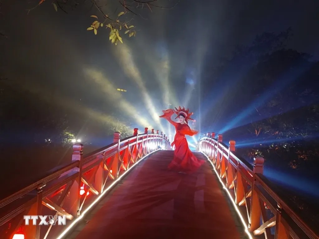 Biểu diễn múa nghệ thuật trên cầu Thê Húc trong lễ ra mắt chương trình trải nghiệm ‘Ngọc Sơn-Đêm huyền bí.’