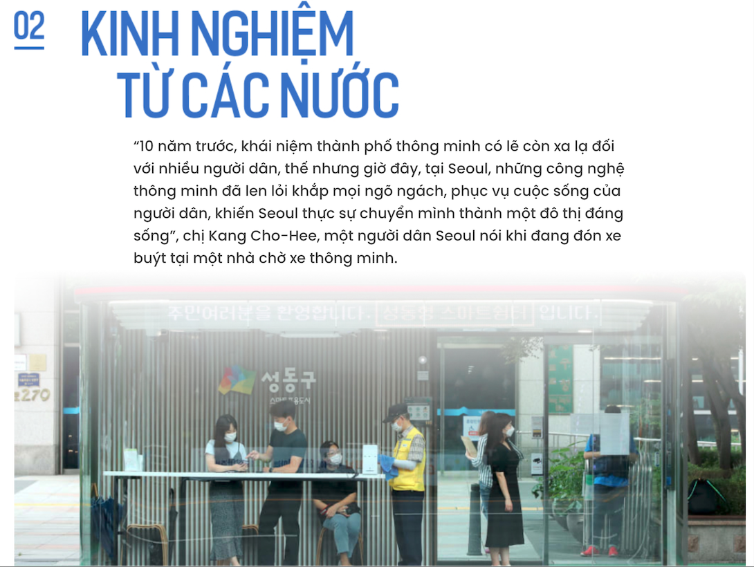 Những nhà chờ xe buýt được trang bị bộ sạc điện thoại di động không dây, wifi tốc độ cao, camera giám sát thông minh báo hiệu xe buýt sắp đến, màn hình hiển thị thông tin thời tiết và lịch trình các tuyến xe… là một trong số hàng trăm dự án ứng dụng công nghệ để xây dựng thành phố thông minh tại Seoul, khiến Hàn Quốc nổi lên như một quốc gia dẫn đầu trong việc phát triển đô thị thông minh tại châu Á.